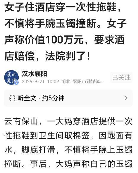想钱想疯了!云南保山,一57岁大妈住酒店,洗完澡后,感觉耳朵进水,她穿酒店提供的一次拖鞋到卫生间取棉签,不料,卫生间地面有水,大妈脚下一滑,手上带的玉镯子被碰断了,事后,大妈去找酒店,说玉镯价值100万元,要酒店赔,她说自己脚打滑,是因为卫生间地面有水,之所以有水,是因为浴室玻璃门无法关严,洗澡水溅出来,导致她打滑,这才撞断了玉镯,酒店不赔,大妈告到法院,要酒店赔偿100万,再赔偿5万元精神损失费,法院判了! 那天早上,邓大妈刚洗完澡,觉得耳朵里进了水,便想用棉签清理。她穿上酒店提供的一次性拖鞋,踩着微微湿滑的地面走向卫生间的角落。 突然,一阵不稳,她脚下一滑,身体一个踉跄,手上的玉镯子“啪”地一声,断成了两半。 邓大妈捧着断裂的玉镯,心里一阵抽痛。她数次回想,自己明明小心翼翼,可还是出事了。 她仔细看了看地面,认为地上有水,正是因为浴室玻璃门关不严,洗澡水溅了出来。心里隐隐生气:如果酒店能把门关严一点,这一切就不会发生。 第二天一早,邓大妈拎着那只断裂的玉镯子,踏着略显沉重的步伐,走进了酒店大厅。 她的脸色依旧难看,眉头紧皱,眼神里透着一股压抑不住的怒意。前台的工作人员一看到她,连忙迎上去:“大姨,您这是……” 邓大妈抬起手,手里的玉镯子在晨光下闪着裂纹的光芒,她几乎是吼出来的:“这镯子可是我几十年的积蓄啊! 你们的卫生间有问题,我滑倒了,你们必须赔!”话音里带着颤抖,声音大得几乎让周围的住客都侧目。 前台工作人员赶紧稳住情绪,尽量放低声音解释:“大姨,您先别着急,我们理解您的心情。不过,昨天您摔倒的事情,我们也很重视。 当时房间卫生间每日都有清洁,浴室玻璃门也是正常设计。偶尔地面湿滑属于意外情况,我们已尽合理注意义务。” 邓大妈皱着眉头,手指着工作人员,声音越发尖锐:“你们就是狡辩!我滑倒了就是你们的责任!难道我说错了吗?你们的玻璃门关不严,水溅出来,我才会摔倒的!” 工作人员轻轻摇头,试图平息她的情绪:“大姨,您别着急,我们理解您心疼玉镯,也理解您生气。 但是……这个手镯到底是怎么碎的,我们也无从得知。毕竟,您昨天才摔倒,今天才来找我们,房间里没有监控录像,我们无法确认损坏的具体原因。” 邓大妈声音提高:“你们就是推脱!就是你们的错!” 工作人员语气温和,但态度坚决:“大姨,我们无法否认您的滑倒,但也无法断定是酒店设施导致玉镯损坏。 您放心,我们会记录您的意见,也会反映给管理层,但关于赔偿,我们必须按照事实来处理。” 邓大妈气得手抖,胸口起伏剧烈,周围的客人纷纷看向她,场面一度有些尴尬。她一边盯着工作人员,一边喃喃自语:“这镯子,可是我几十年的积蓄啊……为什么会这样……” 工作人员见状,耐心地说:“大姨,我们真的理解您的心情。您滑倒了,这本身就很不幸,但这个玉镯的损坏,我们没有办法确认是因为地面湿滑还是因为其他原因。希望您理解,我们也无意回避责任。” 邓大妈捏紧手里的镯子,眼眶微红,心里却清楚,自己无法提供证据证明酒店存在过错。她气得说不出话来,只能站在大厅里,双眼死死盯着工作人员。 双方意见无法调解,邓大妈一气之下将酒店告上了法院,请求赔偿玉镯100万元,并额外赔偿5万元精神损失费。 案件进入审理阶段后,法官仔细查看了证据。邓大妈当天并未拍照或录像,事故发生时也没有立即报警,第二天才去报警备案。 玉镯断裂的原因无法直接证明与酒店设施有关。法官指出,民事赔偿要求“过错与损失有直接因果关系”,而邓大妈缺乏充分证据,因此举证不能,不利后果应由她承担。 最终,法院裁定驳回邓大妈的诉讼请求,酒店不承担赔偿责任,同时由邓大妈承担本案诉讼费5750元。判决一出,引发网友热议。 不少网友表示,邓大妈自己未采取必要防护措施,玉镯断裂属于日常意外,不应完全归咎酒店。有网友调侃:“一副镯子值100万,摔碎了还要酒店买单,这也太心大了吧。”