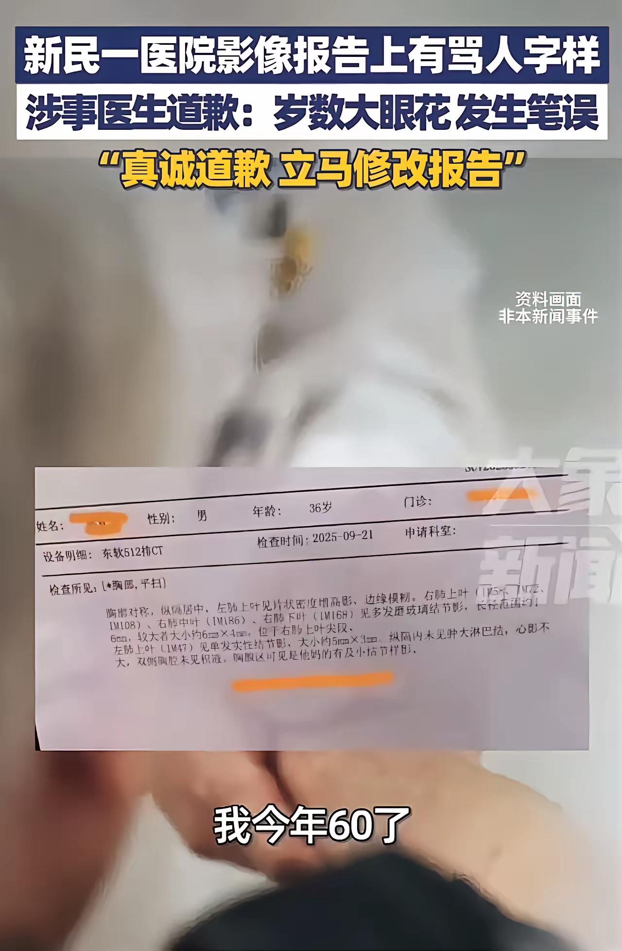 辽宁新民,男子去医院看病,拿到CT检查报告懵逼了,上门居然有骂人的字样!男子:“我花钱来看病,还要被骂!”涉事医生:“岁数大眼花,打错字了,真诚道歉!”网友:你要是把药也看错了怎么办,年龄不行了就应该及时退出岗位,干力所能及的事情!辽宁新民,一名男子怀着一颗焦虑的心走进医院,期待着医生的诊断能带来一线希望。然而,当他拿到自己的CT检查报告时,却被一串令人震惊的字眼狠狠击中了心底的那根敏感神经——“你这个老不死的,别再祸害人了!”这不是普通的医患交流中的一句无心之语,而是直接写在报告上的“骂人字样”。 男子一脸懵逼,心中满是愤怒和委屈:“我花钱来看病,难道还要被这样骂?”他难以相信,曾经以为的“救死扶伤”竟然变成了“伤人至深”的一幕。事情的真相逐渐浮出水面:涉事医生竟然坦言是“眼花打错字”,只是一时疏忽,真诚道歉。 然而,这个“打错字”的解释,能否真正平息公众的愤怒?网友们的反应瞬间点燃了热议的火药桶。“你要是把药也看错了怎么办?”有人质问,“年龄不行了就应该及时退出岗位,干力所能及的事情!”更有人直言:“医生的责任心和职业素养,难道只是一句‘打错字’就能轻描淡写过去的吗?” 这起事件折射出一个深层次的问题:在医疗行业,责任心和职业操守究竟还剩多少?一个“打错字”就能轻易被原谅吗?更别说,字眼中的“骂人”到底是疏忽还是潜藏的职业冷漠?在我们这个时代,公众对“医德”的期待早已超越了单纯的技术水平,更关乎一个行业的底线和尊严。 细想之下,或许这不仅仅是个别医生的失误,而是一个行业的缩影——在快节奏、高压力的环境下,责任感似乎变得越来越稀缺。每一个“打错字”的背后,都是对职业责任的漠视;每一句“骂人”的字眼,都是对患者尊严的践踏。 这个事件引发的热议,远远超出了一个简单的“打错字”。它让我们不得不反思:在这个信息高速流通的时代,公众的忍耐底线在哪里?我们是否还应该相信“医者仁心”?还是说,只有真正从心底尊重每一位患者,才能让“医患关系”回归到相互理解和信任? 或许,我们都需要一场关于职业责任的深刻反思。毕竟,只有当每个人都以“责任”二字为底线,社会的温度才能真正升温。让我们期待,那些在岗位上坚守初心、用心服务的医者,能用行动重塑行业的尊严,也让每一份付出都不被轻视。辽宁CT检查 辽宁看病