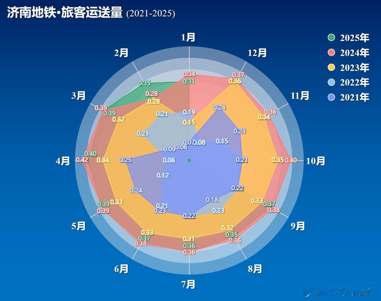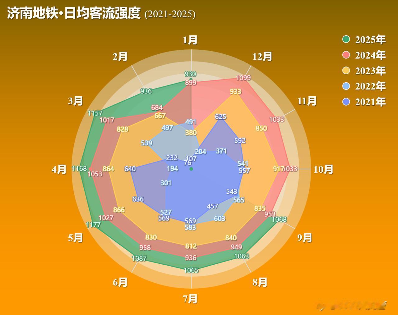9月济南地铁完成旅客运送量1068.1w人次,同比增长12.12%,环比8月份略增0.48%;日均运送旅客35.6w人次,同比增长3.83%,参考往年数据,济南地铁9月份日均客流也是普遍高于8月,增量应该主要源于1号线大学城段的客流;9月客流强度0.37万人次每日每公里,同比降低2.49%[无辜笑][无辜笑]。由于地铁4/6/8号线、有轨济阳线和高新云巴将在12月前后开通,11月虽然有新线开通的可能性不大但仅有30天,所以10月份也是济南地铁在1/2/3号线阶段最后一次刷新月最高客流量【1177.3w】的机会,但由于十月上旬的连续降水,地铁客流大幅下滑,所以10月份济南地铁的月客流量预计也就在1100w上下了[惊喜][惊喜]。依据交通运输部的客流计算方法,12月开通的地铁4/6/8号线和有轨济阳线都会被纳入轨交客流量统计,而高新云巴将不计入,因此截至12月底济南地铁运营里程将达到217.8km,客流强度突破0.4的话日均客流要达到87w人次以上,客流强度0.5的话日均客流强度需达到109w人次,在2025年底的线网条件下,预计济南地铁客流强度会维持在0.4-0.5之间[黑线][黑线]