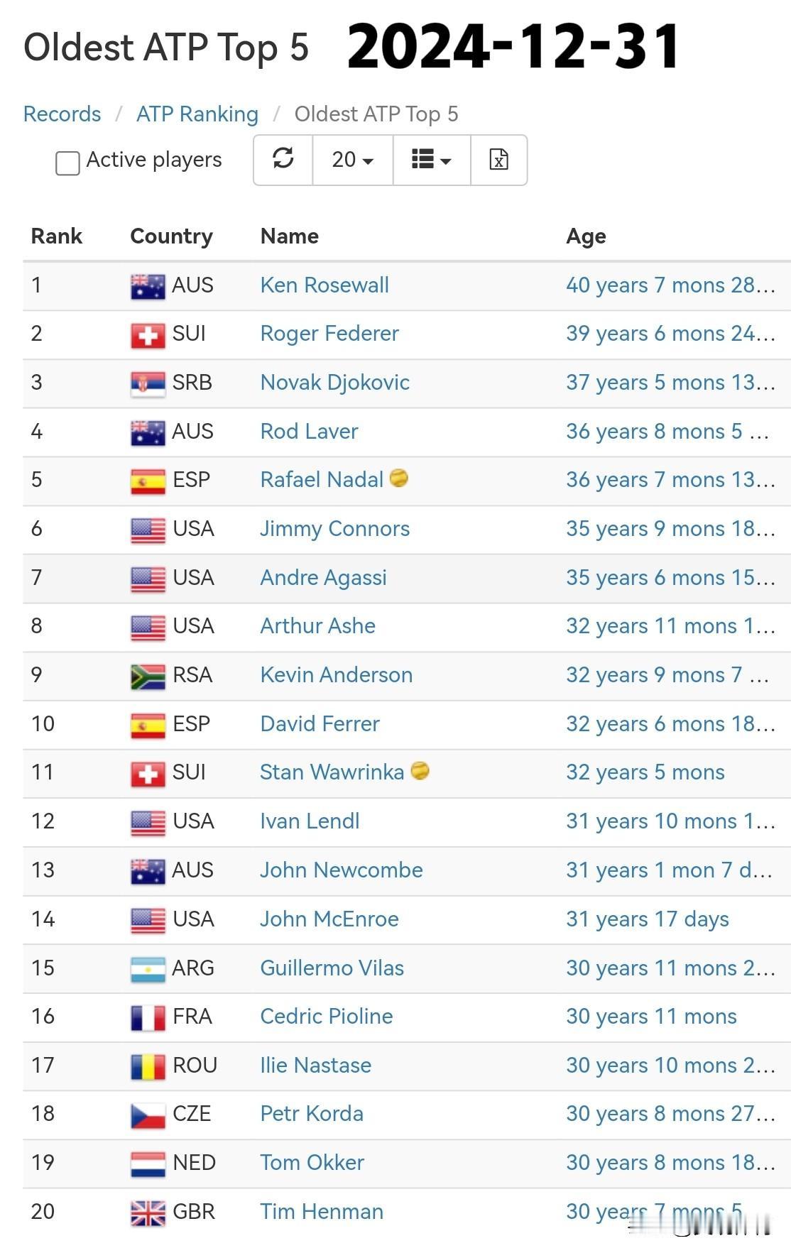 年龄最长的ATP世界排名前五的球员排序 费德勒名列第二,德约科维奇名列第三。还差一年,德约科维奇可以超越费德勒。 排名第一的是澳大利亚选手罗斯威尔,年龄是40岁7个月28天。