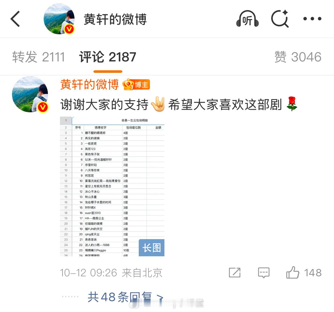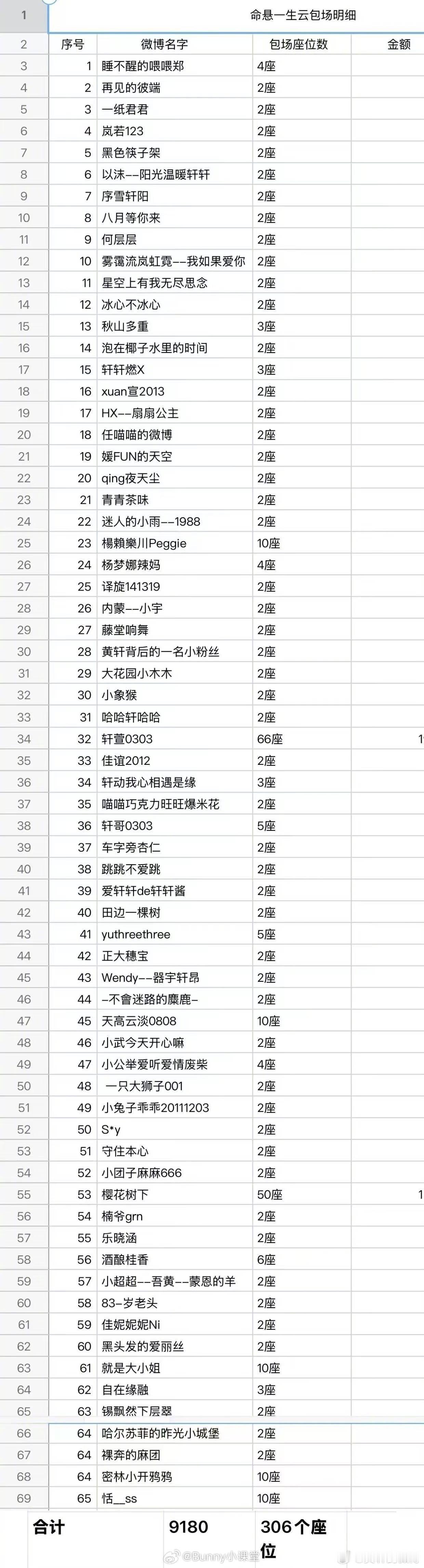 黄轩拉了个表感谢粉丝,不仅有粉丝id,还有粉丝们的包场座位数,也是头回见……