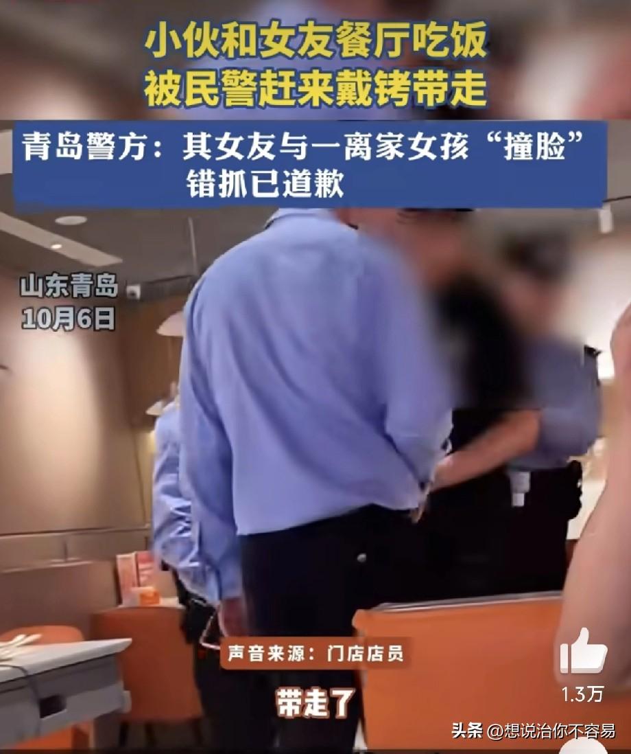 青岛一小伙原本好好的和女友在餐厅吃饭,谁知下一秒却被三名民警给拷走。 原来是有人到警察局报警说自己13岁的女儿走丢了,并提供了一张照片。而民警在寻人过程中发现小伙的女友和照片经过人脸识别后高度吻合。 民警怀疑小伙拐卖未成年儿童,于是调取信息给小伙打电话,可没想到小伙不仅不接,还把民警的工作电话全部拉黑,迫不得已,民警只能进入店内抓人。 最终,民警发现是比对错误,又把人送了回来。要说这事也真是难绷,民警比对错误,小伙又不接电话,只能说小伙是难逃一劫。