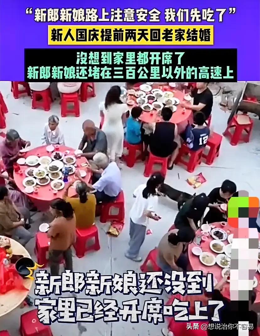 笑死了,这一看就是第一次结婚没经验。 一对新人国庆回老家结婚,已经提前两天出发了。 可没想到家里都开席了,他们还堵在300多公里外的高速上。 这下好了,别人结婚都是忙的没空吃上席,你们倒好,不忙,就是只能在手机上看别人吃你们的席。