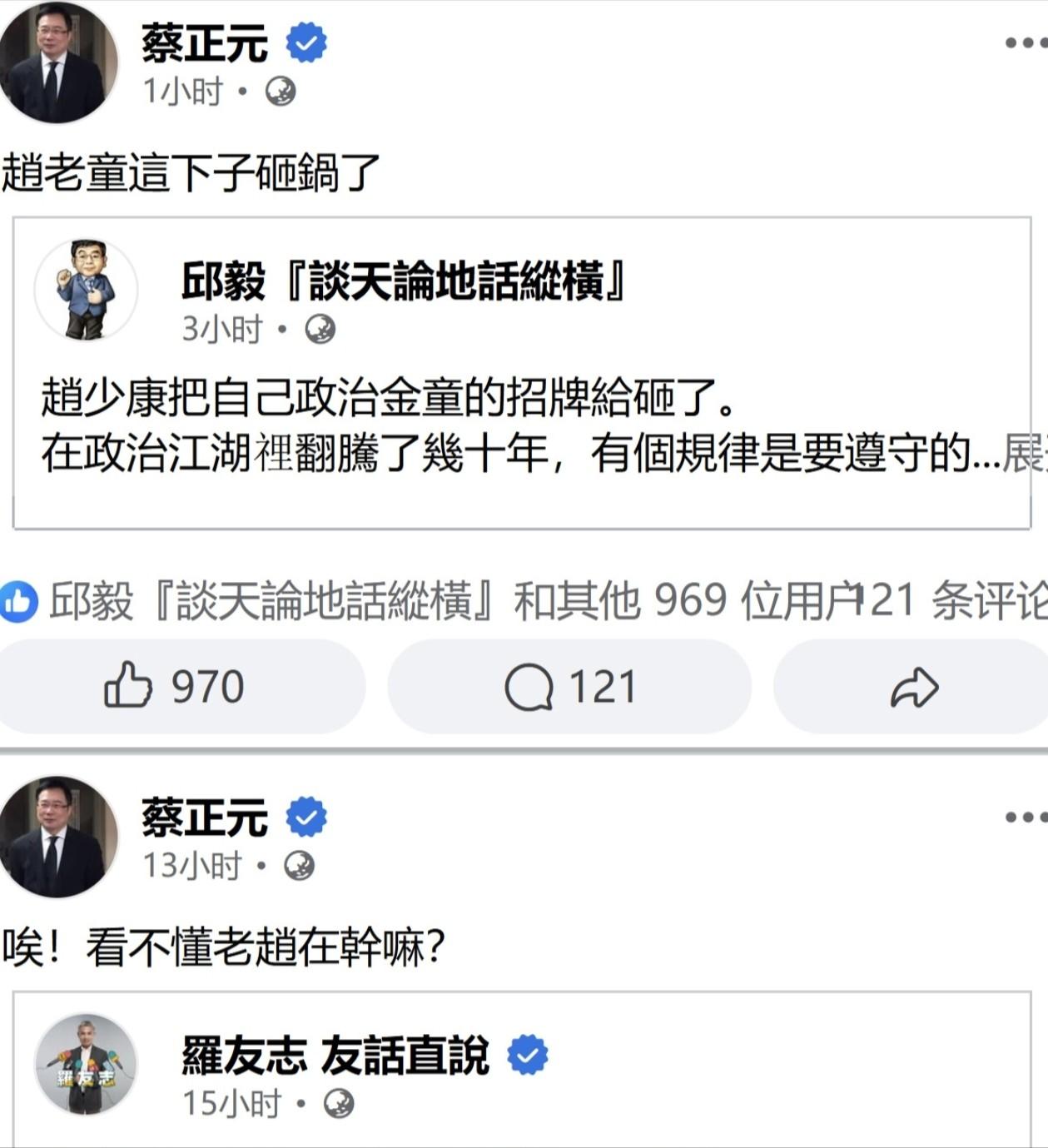 邱毅说,他今天听了蔡正元痛批赵少康的言论以后,觉得蔡正元批的太爽了。赵少康这个外省权贵在台湾地区作威作福习惯了,早就还有人这么骂赵少康了。 国民党主席选战打得火热,但最精彩的戏码,主角却不是台上的候选人,聚光灯意外地打在了郝龙斌的“军师”,那个曾被誉为“政治金童”的赵少康身上,他没参选,却成了这场风暴的中心。 赵少康这次作为操盘手,本想运筹帷幄,结果却显得与现实格格不入,当初一份民调明明说,只要他亲自出马,就能轻松碾压郑丽文,但他因为媒体行业的“包袱”选择退居幕后,把郝龙斌推到台前。 这本该是军师大展拳脚的时刻,可他出的主意却反响平平,甚至给郝龙斌贴上了“怯战”的负面标签,眼看着选情从初期领先到被郑丽文逆转,地方议长系统也倒戈相向,郝龙斌阵营几乎认定败局,这种溃败感,让赵少康表现出一种“末日疯狂”的姿态,他公开与支持郑丽文的蔡正元互呛,这种失态背后,或许是对自己当初没参选的懊悔,更是无法接受政治现实的挫败感,毕竟,郝龙斌输了,他这个军师也脸上无光。 更要命的是,对手的攻击精准地打在了他的软肋上,蔡正元在回击赵少康指责其为“红统”时,没有陷入谩骂,而是抛出一句:“我们家在台湾四百多年了”,这一下直接把赵少康“外省二代”的身份标签放到了聚光灯下。 这番话的潜台词很清晰:你一个“外省二代”,在统独这种核心议题上有什么资格指手画脚?邱毅的加入,更是火上浇油,他痛批赵少康是“没落的贵族”,是作威作福的“外省权贵”,总摆出一副高人一等的姿态,这些标签,迅速将赵少康描绘成一个脱离本土、维护特定小圈子利益的形象,也让他被指为是蓝营内斗的“最大推手”的行为,似乎找到了动机。 如果说身份争议还是政治攻防,那邱毅接下来的爆料,则直接升级为人格毁灭,他扔出一个重磅炸弹:赵少康与“反中乱港”的关键人物黎智英,关系非同寻常,甚至用“惺惺相惜,狼狈为奸”来形容,这个指控的杀伤力太大了,它把赵少康从一场党内选举的争议,直接拖入政治品格与道德操守的泥潭,邱毅甚至用“三分像人,七分似鬼”来形容赵少康崩塌的形象,语言之恶毒,可见一斑。 最讽刺的是,一个被指控与“乱港黑手”勾结的人,回头却在猛烈攻击对手“太红”,这种巨大的矛盾,让他的所有辩解都显得苍白无力,也让他的形象彻底崩坏。 从策略失算,到身份认同的脆弱,再到政治品格的严重质疑,赵少康在此次事件中陷入了全面的困境,昔日“政治金童”的光环,在复杂的选战、激烈的内斗和致命的指控下,正迅速消散,这不仅是他个人的重创,也折射出台湾政坛里,身份、路线与个人恩怨交织的残酷现实。 以上信息来源于蔡正元讲座