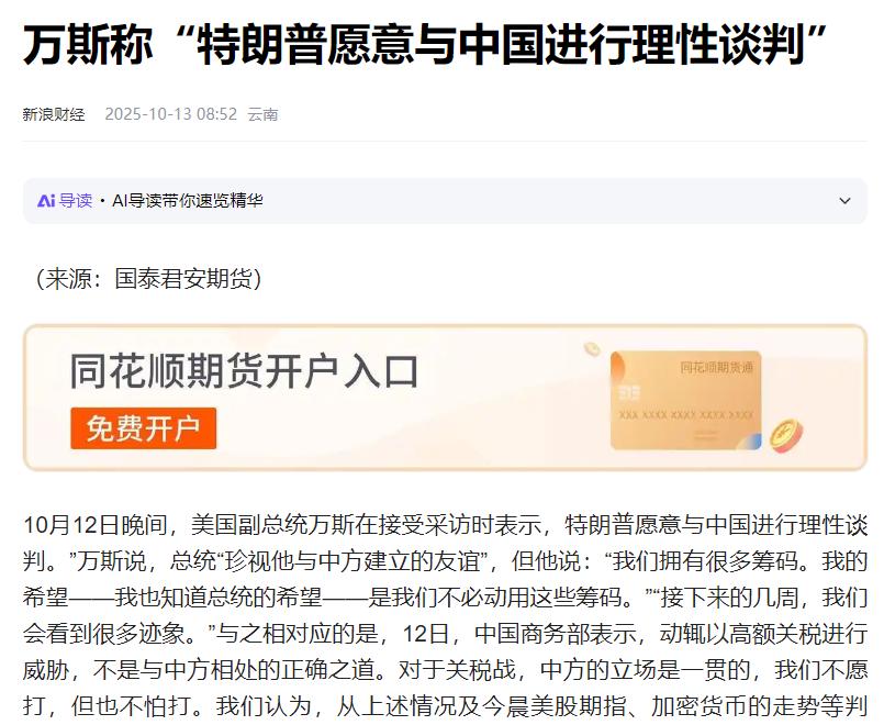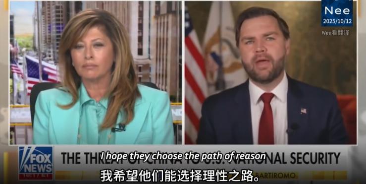 万斯:我们有很多筹码,希望中国理性! 10月12日,美国副总统万斯在福克斯新