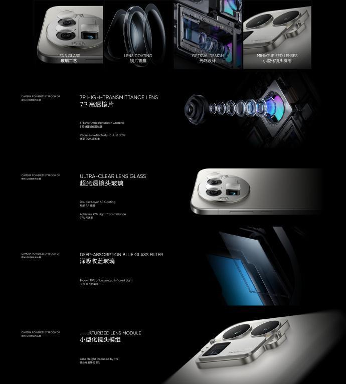 真我与理光在硬件方面合作,共同打造了理光GR 防眩光主摄,作为首个达到理光GR光学标准的手机镜头,带来全新的镜片材料,7P 高透镜片+5 层镜面超低反镀膜,采用高光透双层AR镀膜,大幅提升玻璃透光率,配合深吸收蓝玻璃,确保色彩真实还原
