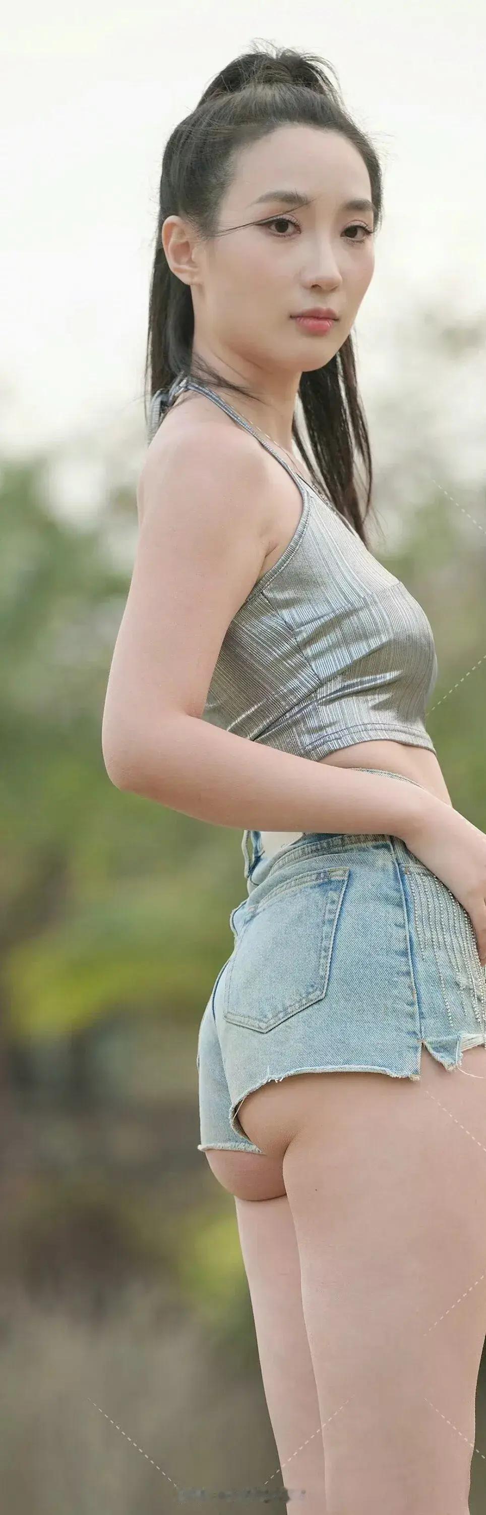 这姑娘在草地上拍照呢。