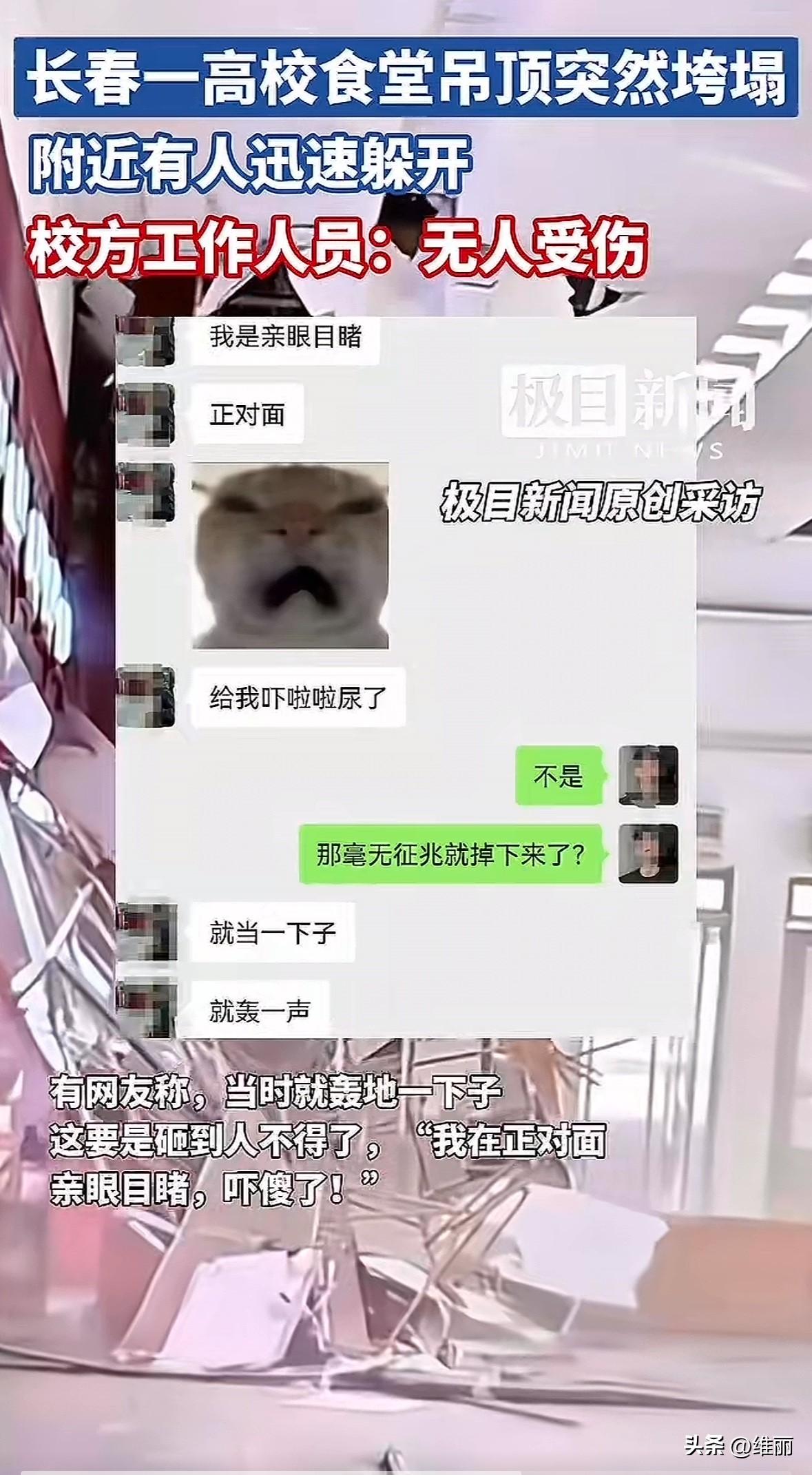 10月13日,有网友发视频说长春工程学院湖东校区食堂吊顶垮塌了。 视频里能看到,食堂窗口旁一片吊顶突然掉地上,附近有人赶紧躲开,穿厨师服的人很快过来处理。有网友说当时声响特别大,亲眼看到吓傻了,庆幸没砸到人。 当天食堂贴了通知,说要改造CV自选餐,从13号起暂停营业。14号校方回应,事发时那块区域在装修,没人员受伤。 这事看着没人受伤算万幸,但校园里不管是装修还是日常维护,安全都得放第一位。吊顶突然塌了,还是暴露了检查不到位的问题。希望学校能好好排查隐患,别等出了事才重视。