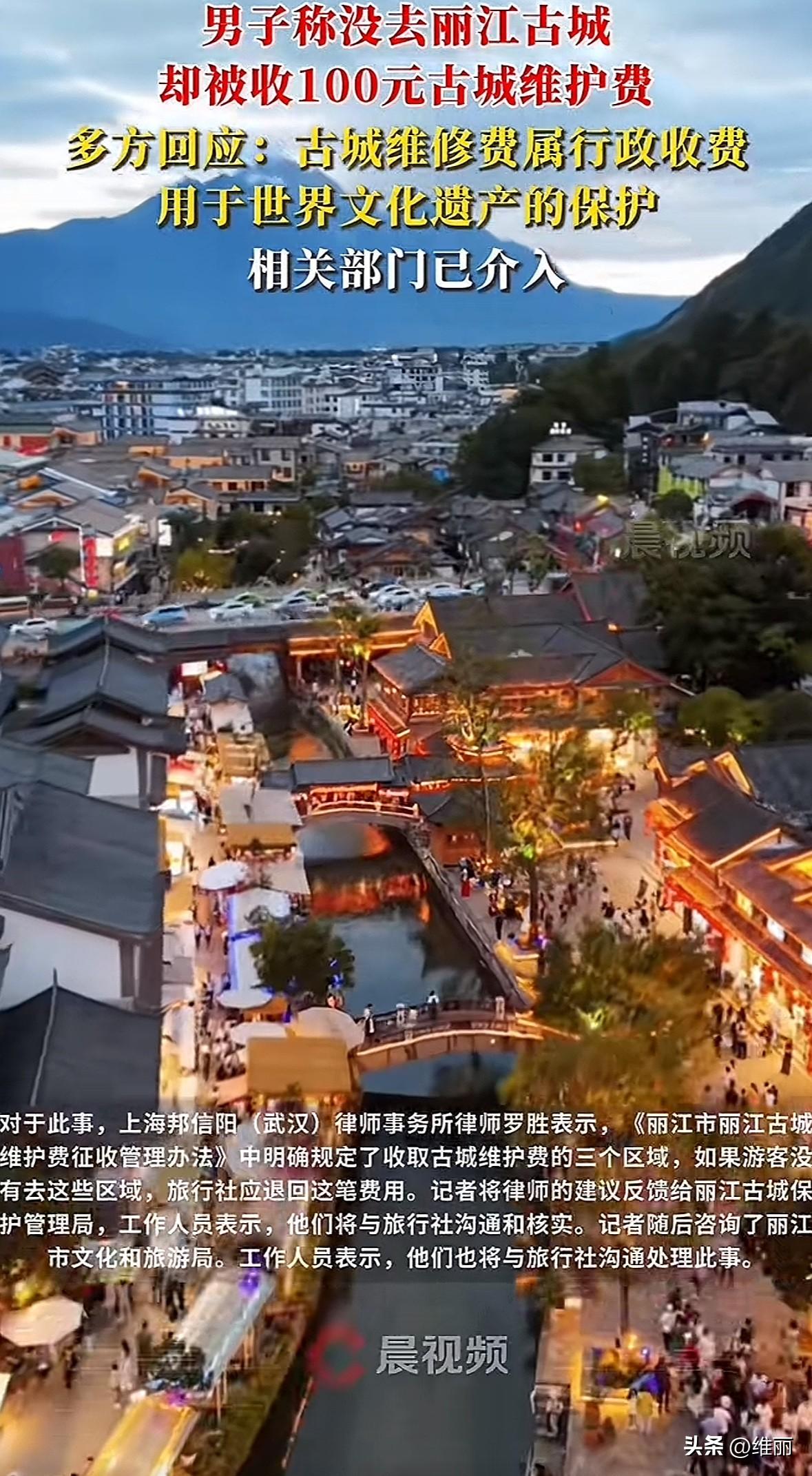 有游客花916元买玉龙雪山双人套票,没去丽江古城却被收了100元古城维护费,这事儿引发热议。 玉龙雪山景区说自己只收门票和车票,这笔钱是旅行社收的。丽江古城保护管理局解释,维护费是行政收费,进大研古城等三个区域才要交,每人50元管一年,用于遗产保护,鼓励旅行社代收。 律师明确这不合规不合法,没去收费区域就不该交钱,得退。现在古保局和文旅局都在和旅行社沟通处理。 其实问题核心是透明度。旅行社默认把费用加进套票不提前说,这是套路。古城要保护收费能理解,但得明明白白,没享受服务凭啥掏钱?游客要的是事前说清,每笔消费都该花得透亮。