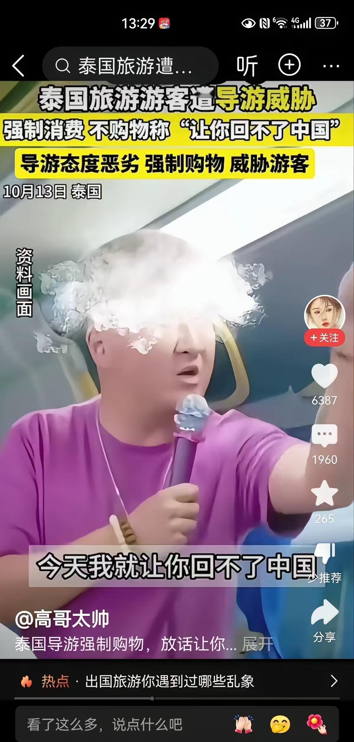 泰国旅游游客遭导游威胁,强制消费,不购物称“让你回不了中国”,导游态度恶劣,强制购物,威胁游客,10月13日泰国。 你说这游客心里能不犯怵吗?好好的出国旅游,本想逛逛泰国的佛寺、吹吹海滩风,结果被导游堵在购物店里,不买东西就被撂下狠话“回不了中国”。这事就发生在10月13日,一群中国游客报了个看似实惠的泰国团,没成想导游全程脸拉得老长,把大巴往珠宝店、ru胶店一停,就开始“训话”:“不买就是不给面子,今天不消费别想走,更别想回中国!” 其实这种糟心事在低价旅游团里早就不是新鲜事了。不少游客图便宜报了几百块的“泰国七日游”,结果行程里大半时间都耗在购物点。导游靠提成吃饭,游客不买,他们收入就没着落,于是就使出威胁、甩脸子这些下作招术。有游客偷偷录了视 频,导游唾沫星子横飞,指着人鼻子说“别以为你能顺利回国,我有的是办法”,那架势看着都让人膈应。 咱老百姓出去旅游图个啥?不就图个开心省心吗?结果碰上这种强制消费的,钱花了不少,心情全毁了。泰国旅游这些年靠着中国游客撑起半边天,可偏偏有这种害群之马,把好好的旅游体验弄成“花钱买罪受”。之前也有导游因强制消费被曝光,可为啥就是管不住?还不是低价团的模式在那摆着,羊毛出在羊身上,游客以为占了便宜,最后被宰得更狠。 现在这事在网上炸开了锅,好多人说“再也不敢报低价团去泰国了”。旅游市场得有规矩,导游得有职业操守,不然再美的风景,碰上这种糟心事儿,谁还愿意去第 二次? 各位读者你们怎么看?欢迎在评论区讨论。