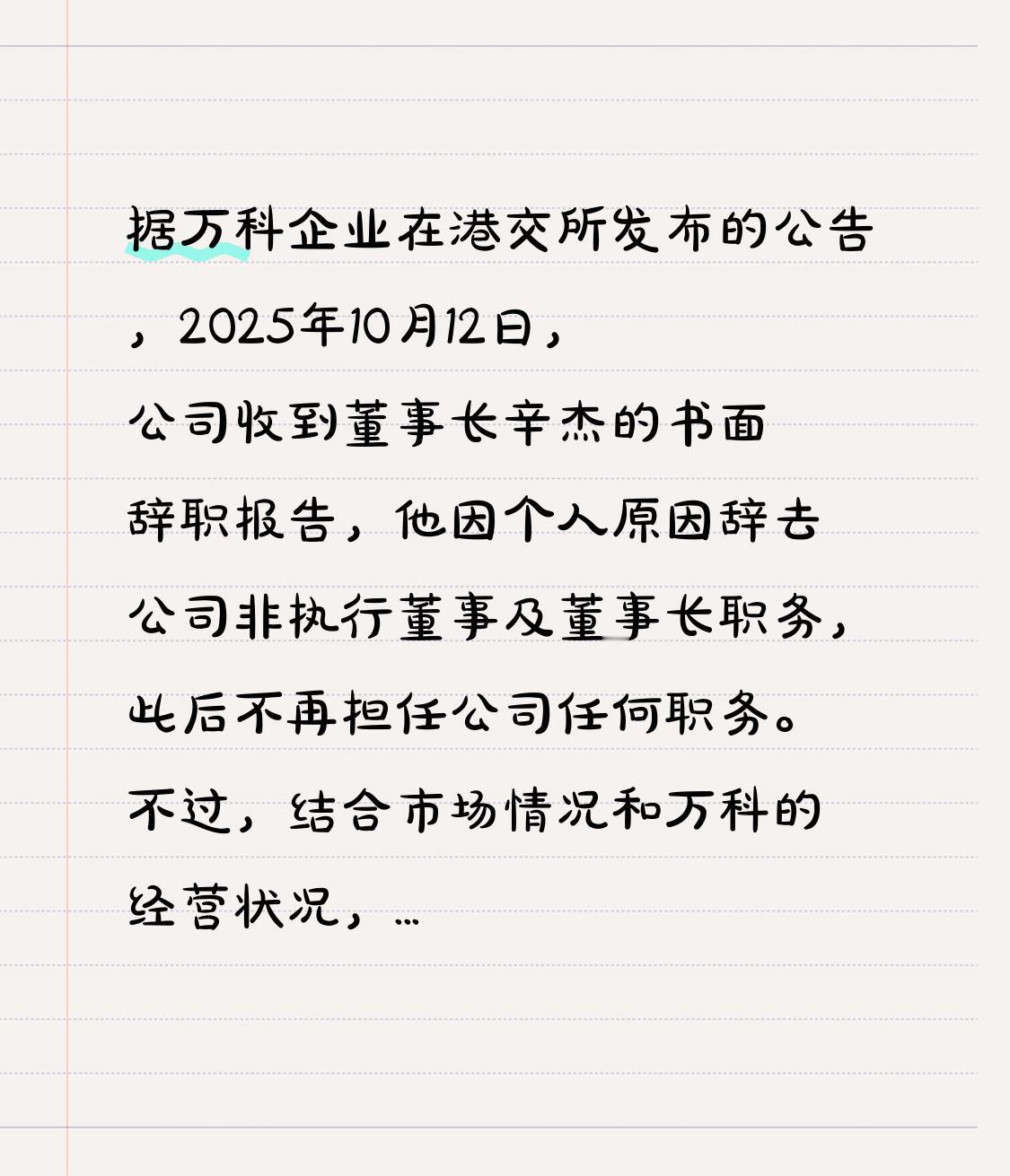 据万科企业在港交所发布的公告,2025年10月12日,公司收到董事长辛杰的书面辞