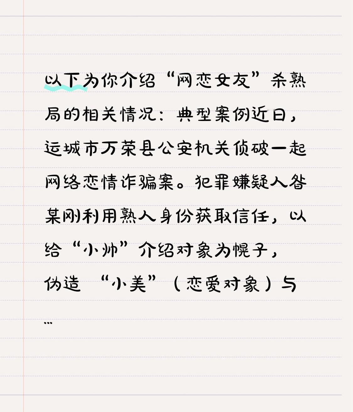 以下为你介绍“网恋女友”杀熟局的相关情况: 典型案例 近日,运城市万荣县公安机关侦破一起网络恋情诈骗案。犯罪嫌疑人昝某刚利用熟人身份获取信任,以给“小帅”介绍对象为幌子,伪造 “小美”(恋爱对象)与 “老板” 两个身份。他一边以 “小美” 之名营造亲密恋爱氛围,一边以 “老板” 身份佐证 “小美” 的处境,降低小帅的警惕心。随后,昝某刚编造 “生意周转需资金”“银行卡冻结无法提现”“化妆品压货需周转” 等理由,多次向小帅索要钱财。小帅先后转出10余万元,均被昝某刚用于赌博挥霍。在警方压力下,昝某刚主动投案自首,目前已被依法刑事拘留,案件正在进一步侦办。 “网恋女友”杀熟局常见特点 ●虚假甜蜜背后藏风险:犯罪分子利用虚拟身份,假扮成善良、懂事的恋爱对象,逐步拉近距离,获取信任后,以各种理由索要钱财甚至个人信息。受害者往往在投入大量感情和金钱后,才发现自己深陷骗局,财产和感情双重受损。 ●利用公众认知盲点:很多人对网络交友风险认识不足,习惯在网络上随意泄露个人信息,缺乏对网络诈骗手段的了解,误以为“遇到真爱”就可放松警惕。部分受害者被骗后因羞耻或恐惧,不愿报警,让犯罪分子逍遥法外。 ●利用网友信任误区:许多网友存在“网络上的人都可信”的误区,盲目信任对方。犯罪分子还会用心理战术,引导受害者陷入财务陷阱,如以“帮忙投资”“借钱还债”等为由骗取资金。 应对建议 ●不轻信陌生人,在未见面、未核实身份的情况下,不随意泄露个人信息。 ●保持理性,不被虚拟的甜言蜜语冲昏头脑,不轻易转账或提供银行账号。 ●遇到涉及钱财的请求,要多方核实,可以咨询亲友或报警求助。 ●加强网络安全意识,安装正规安全软件,避免病毒木马盗取信息。婚恋型诈骗 网络婚恋诈骗 网恋借款型诈骗 恋爱诈骗 山西婚恋诈骗 乡村婚恋诈骗 杀熟骗局