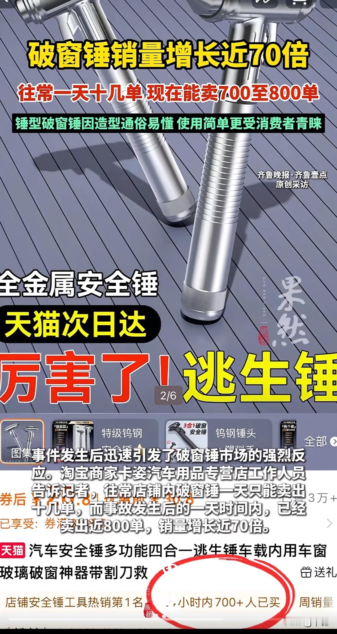 10月13日凌晨,成都天府大道一辆新能源车与前车碰撞后越过绿化带起火,车门无法打开,路人砸窗救援未果,驾驶人邓某某不幸身亡,经检测其涉嫌酒驾。 这事一出,破窗锤卖爆了。有淘宝商家说,之前一天才卖十几单,事故后一天卖了近800单,涨了快70倍,带安全带割刀的全金属款最受欢迎。 新能源车撞后车门打不开不新鲜,碰撞可能让车身变形卡主车门,也可能触发断电保护,让电子门锁失效,机械解锁不少人又不会用。 买破窗锤得选对,要砸车窗边角才管用,有些双层夹胶玻璃还得选威力够的款式。关键是平时得放顺手的地方,还得练会用,不然紧急时刻真慌神。 安全这事儿,工具备着是后手,规范驾驶才是根本。