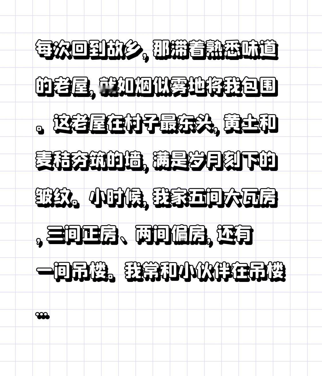 每次回到故乡,那滞着熟悉味道的老屋,就如烟似雾地将我包围。这老屋在村子最东头,黄土和麦秸夯筑的墙,满是岁月刻下的皱纹。 小时候,我家五间大瓦房,三间正房、两间偏房,还有一间吊楼。我常和小伙伴在吊楼阳台玩游戏、捉迷藏。老屋前大人们会放几块石头,夜晚大家聚在这儿谈庄稼,“相见无杂言,但道桑麻长”,满是纯朴与自然。 后来兄弟姐妹走向天南地北,老屋也渐渐破败。即便它已不是记忆中的模样,但它始终是我心中的根,承载着满满的温暖回忆。