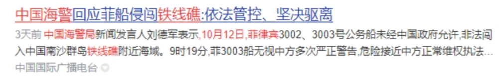 从直升机吹翻,到水炮压制,再到今天的船体冲撞!10月12日,在铁线礁海域,中国海