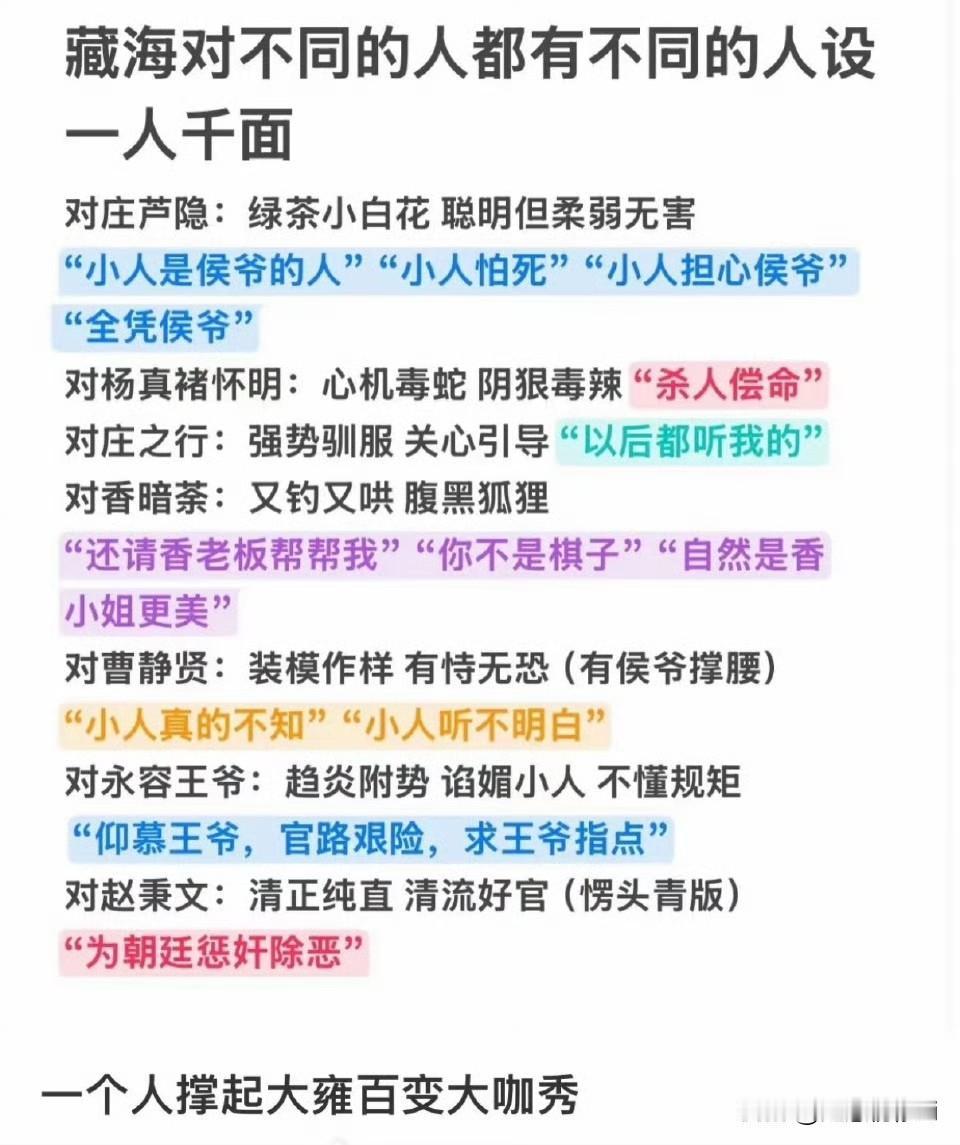 藏海的人设是千变万化的,是因人而异的,所以观众看的才那么过瘾,跟每个人的对手戏都不一样,出人意料,很新鲜很复杂又很迷人的多面藏海,难怪观众称他是万人迷呢,看见藏海大人,谁能不着迷呢