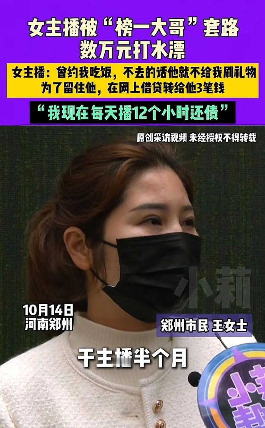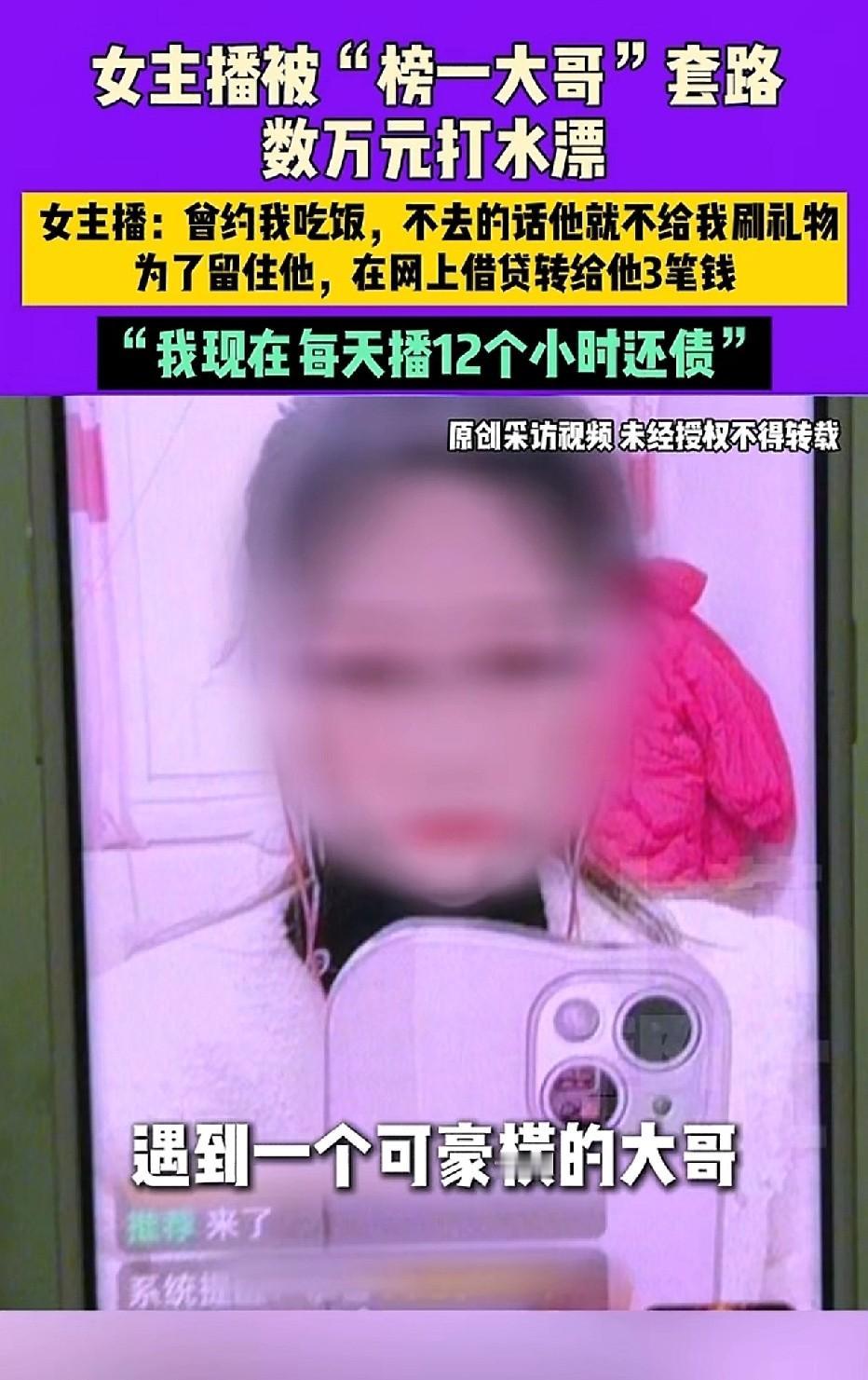 天上没有掉馅饼的事! 一个月前,有位女孩开始做直播,不到半个月就有个男的经常打赏,一周给她赚了三千块。过了二十多天,那男的说要是不线下见面就不再打赏,女孩想着能多赚钱就去见了。后来这男的先后问她借了一万多、两万多,总共五万六,借了之后就慢慢没了联系。现在女孩每天直播十二小时还网贷,去记者那里求助才发现自己被骗了。 警察说这属于经济纠纷,只能自己想办法。其实这种"榜一大哥"套路很多人中过招,先给点小钱博信任,再编各种理由借钱。现在网上都在讨论,谁贪小便宜谁吃亏,别看人家打赏多,说不定是骗子设的圈套。 女孩现在还在直播间挣钱,但欠的债一天比一天多,也不知道什么时候能还清。