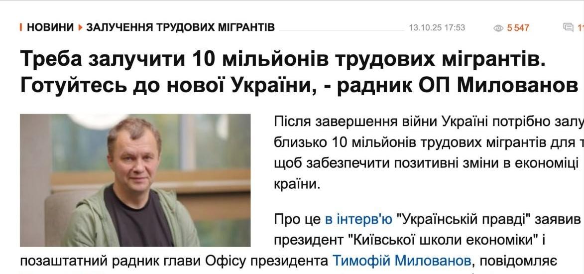 为新乌克兰做好准备:这个国家需要 1000 万移民。 据乌克兰媒体报道称,乌克兰总统办公厅顾问米洛瓦诺夫表示:“战争结束后,我们将需要引进大约 1000 万劳工移民。” 经过三年战火,乌克兰的 "家底子" 早就被掏空了,不找外人来帮忙,别说重建,连老人的养老金都发不出来。 战前乌克兰还有 4300 万人,可到 2025 年只剩下 3400 万了,一年多就少了近千万人。这些流失的不是数字,全是能干活、能养家的劳动力。 现在乌克兰境内能上班的只有 950 万人,却要养活将近 1900 万不干活的人,这里面大多是老人和孩子。想想看,1 个干活的要养 2 个不干活的,这哪是养老,简直是把干活的人往死里逼。 米洛瓦诺夫盯着在职和退休的比例说事儿,太懂其中的要害了,养老金是现收现付,年轻人交的钱给老人发工资,现在交钱的人少了,领钱的人多了,再过两年可能真就发不出了,那千万老人的日子该怎么过? 更要命的是,跑掉的全是能顶事儿的年轻人。这场战争逼得 1400 多万人背井离乡,其中 630 多万逃到了欧洲其他国家,虽然有 450 万人陆续回来,但大多是拖家带口的妇女儿童,真正能立刻上工的壮劳力没多少。 更揪心的是,逃出去的人里 65% 都是工作年龄段的,其中 IT 工程师和医生占了 40%,这些可是一个国家的 "技术脊梁" 啊。 就说医院吧,战前能正常接诊的医生现在少了一半,有的乡镇医院只剩一两个老大夫,连感冒发烧都得排队,更别说治大病了。这种技能人才的流失,比房子被炸还难恢复,毕竟房子能修,人走了可不容易回来。 再看人口结构,简直是雪上加霜。乌克兰现在的年龄中位数都 41.8 岁了,比咱们国家还偏高,18 到 35 岁的男性只占总人口的 15%,年轻人几乎断档了。 生孩子的人也越来越少,2025 年全年才出生 11 万个孩子,比战前少了近 60%,照这个速度,再过十年劳动力只会更少。 而且战争让预期寿命都降了,以前能活到 72 岁,现在平均才 68 岁,男人更是只有 64 岁,这么多老人要养,这么少的年轻人干活,不引进移民就是坐等着社保体系崩溃。 可能有人会问,不能靠自己人慢慢恢复吗?真的等不起啊。二战后德国的例子就在眼前,当时德国也是一片废墟,劳动力死的死、伤的伤,后来从土耳其、希腊引进了 260 万外籍劳工,这些人占了当时就业人口的 12%,硬是撑起了汽车和机械制造业的复苏。 瑞典战后也一样,从芬兰、意大利招工人,才把木材和钢铁产业搞起来。乌克兰现在的情况比当年的德国还糟,德国当年没丢这么多人口,也没这么严重的老龄化,人家都要引移民,乌克兰要 1000 万真不是夸张。 再说重建的活儿,没人根本动不起来。这场战争造成的直接损失快 1520 亿美元了,4700 多处文化资产被砸,顿涅茨克、哈尔科夫这些地方的房子、公路、水电设施全毁了。 黑土地本来是 "欧洲粮仓",现在埋满了未爆弹药,没人清理根本种不了地;工厂被炸得只剩框架,重启生产得有工人拧螺丝、开机器。这些活儿都得靠壮劳力,本地那点人连维护基本民生都不够,哪有精力搞重建? 有人担心引移民会乱,其实早有成熟的办法。加拿大、澳大利亚都是靠移民发展起来的,瑞典更是早早搞了多元文化政策,给移民发工作许可,还帮他们学语言、找房子,最后移民和本地人相处得挺好。 乌克兰以前对外国劳工管得严,要本地没人才能引进,现在肯定得改政策,比如给移民发长期居留证、让孩子免费上学,这样才能留住人。 而且移民来是干活挣钱的,不是来吃闲饭的,就像当年去德国的土耳其工人,自己挣了钱,也帮德国成了工业强国,这是双赢的事。 欧洲现在也帮不上太多忙了,他们已经接了 430 万乌克兰难民,德国 115 万,波兰占了总人口的 2.6%,早就撑不住了。 再让他们接人不现实,所以乌克兰只能自己主动招劳工,比如从周边劳动力多的国家引农业工人、基建工人,从有技术的国家招工程师、医生,把缺的岗位一个个补上。 说到底,1000 万移民不是选择题,是生存题。要是没人来干活,养老金发不出,田地荒着,工厂 不开门,别说 "新乌克兰",就连老百姓的基本日子都过不下去。 当年德国靠移民站起来了,瑞典靠移民富起来了,乌克兰只要能把人引来、留住,好好让大家一起干活,总有一天能把被炸的房子盖起来,把荒了的地种起来,让老人能领到养老金,让孩子有学上。这不是空想,是实实在在的活路,也是唯一的活路。