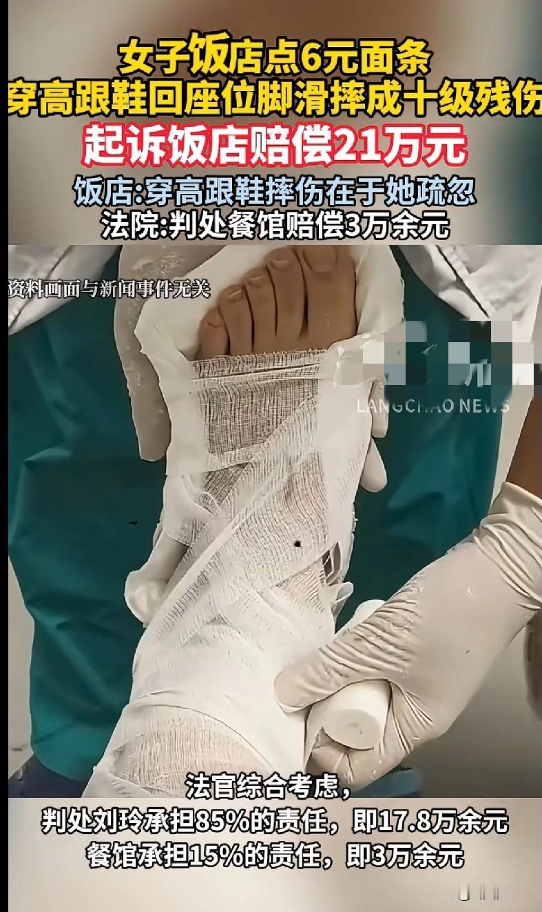 家人们快看这事儿多离谱!湖南一女子饭店点了碗6元面条,穿高跟鞋回座位时脚滑,摔成十级伤残,然后起诉饭店索赔21万!结果法院判饭店只赔3万多,因为主要是她自己穿高跟鞋没注意。 咱就说,穿高跟鞋本来就容易不稳,吃饭的时候咱还是悠着点吧。这姑娘为了6元面条,把自己摔成伤残还索赔这么多,最后也没如愿。你们觉得这责任该怎么分?遇到这种事你会咋办?评论区聊聊~