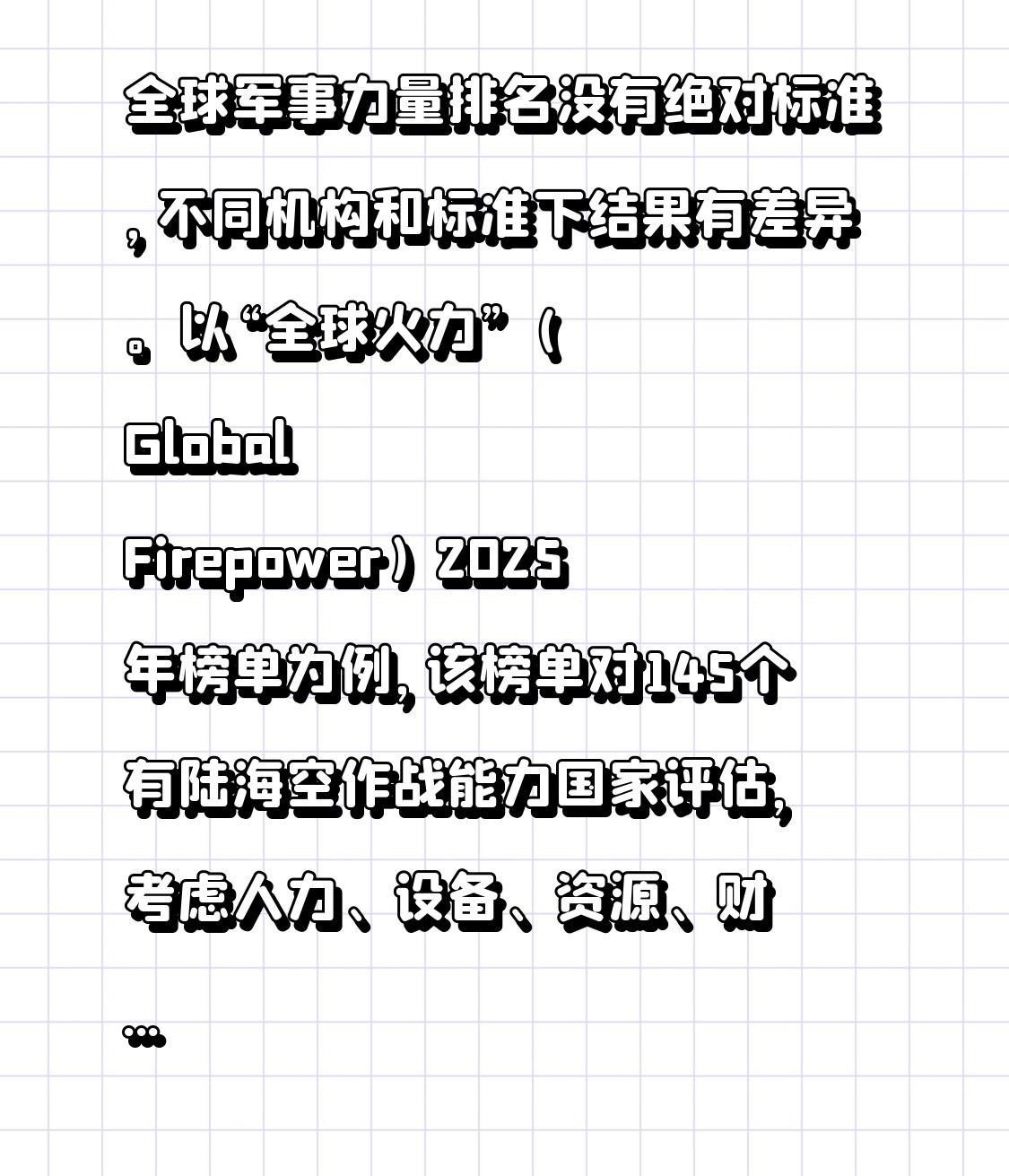 全球军事力量排名没有绝对标准,不同机构和标准下结果有差异。以“全球火力”(Global Firepower)2025年榜单为例,该榜单对145个有陆海空作战能力国家评估,考虑人力、设备、资源、财政、地理等60多个因素,指数越接近0实力越强。排名情况如下: 第一梯队 ●美国:排名第1,军事力量指数0.0744。国防预算全球第一,支撑强大海上、空中力量与全球部署网络。在常规作战、远程投送、核威慑、太空军事技术及网络战领域领先。 ●中国和俄罗斯:并列第2,军事力量指数0.0788。中国现役军人多,海军发展快,高超音速导弹、隐身战机等列装,太空与反导能力进步。俄罗斯核武库规模全球最大,“萨尔马特”洲际导弹等战略武器强大,常规力量中陆军、空天军、海军各有优势。 第二梯队 ●印度:排名第4,军事力量指数0.1184。军队规模庞大,武器进口多元化,但国防工业自主化水平低。 ●韩国:排名第5,军事力量指数0.1656。军队现代化程度高,海军宙斯盾系统先进,与美国协同的指挥体系信息化程度高。 ●英国:排名第6,军事力量指数0.1785。军队规模小但精锐,两艘航母可实现远洋投送。 ●法国:排名第7,军事力量指数0.1878。有完整国防工业体系,“戴高乐号”航母等装备可支持远距离军事行动。 ●日本:排名第8。自卫队装备技术水平高,海上自卫队反潜能力全球领先,直升机航母改装后战力提升。 ●土耳其:排名第9。军队规模在中东居首,国产无人机表现出色,装备国产化率提升。 ●意大利:排名第10。军事体系完备,海军舰艇制造能力欧洲领先。 此外,榜单11 - 20名国家特定领域或地缘场景中作用关键,如伊朗导弹力量、以色列防空系统、乌克兰实战能力等。需注意,该排名仅作参考,未完全涵盖科技研发、后勤动员、战略意志、联盟体系等军事实力核心维度。中美军事实力 军事实力 国军事实力 军力对比 军事实力排行榜 各国军力 军力实力
