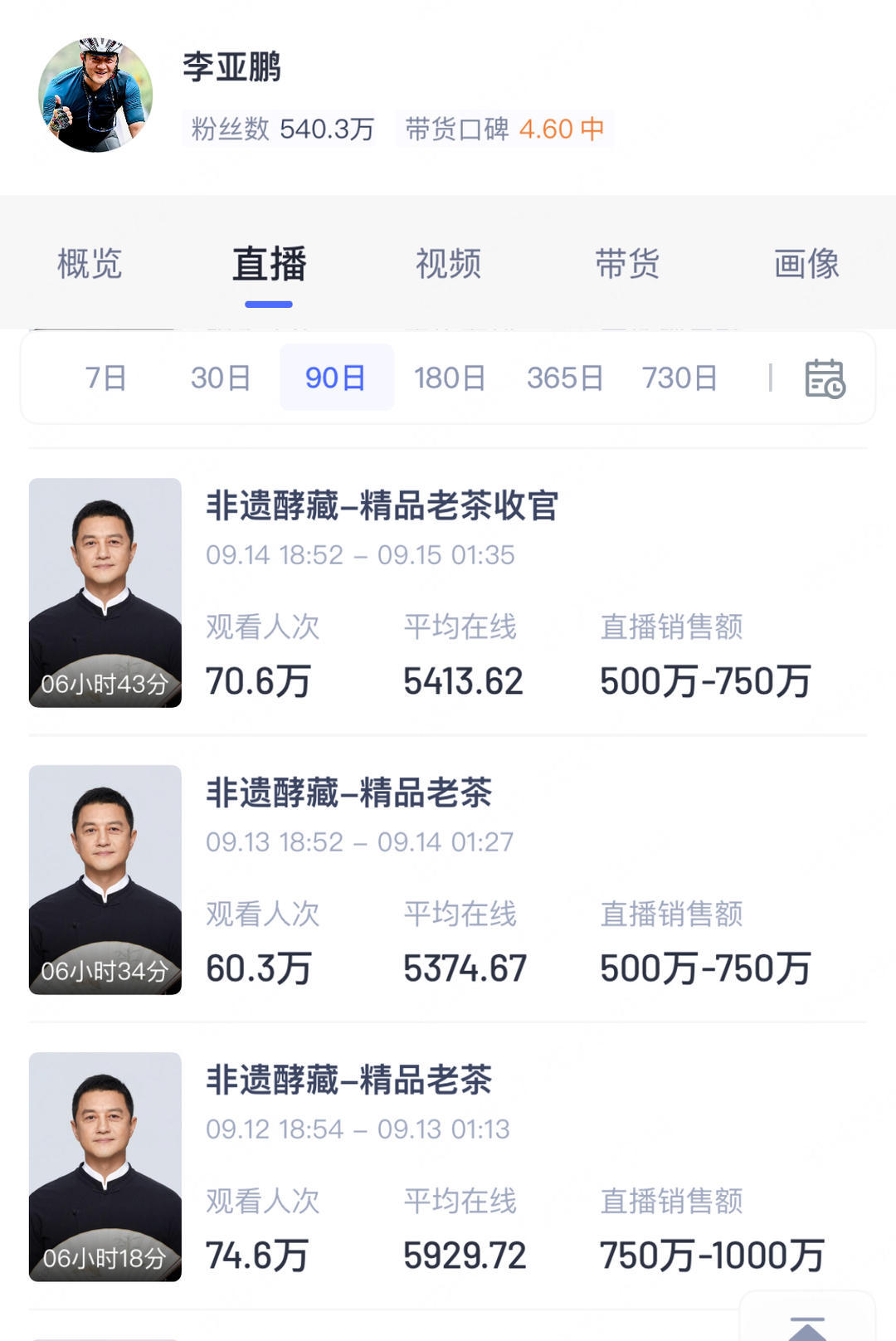 【#李亚鹏曾注册31个海哈金喜商标#】#李亚鹏直播卖茶9月销售额超3600万# 10月14日,李亚鹏和海哈金喜官宣离婚,结束了两人接近五年的婚姻。天眼查数据显示,李亚鹏名下有九家企业,8家在存续状态,均与海哈金喜无关联。但名下的北京中书艺莲网络科技有限公司曾在2023年申请了31个海哈金喜商标。李亚鹏近年来一直在个人账号直播售卖茶叶,其账号视频报价为54000元-81000元,账号九月直播13场,平台数据显示直播销售总额超过3600万。李亚鹏账号粉丝540万,数据平台显示其账号视频报价为1-20s视频5.4万元,21-60s视频6.7万,60s以上视频8.1万元。其账号十月以来还没有直播,但在九月份有13场直播,观看人次40万到180万不等,直播销售额最高的一场为750万到1000万,九月13场直播累计销售额3600万到5825万。海哈金喜账号粉丝为32万,近30日直播销售额25-50万。