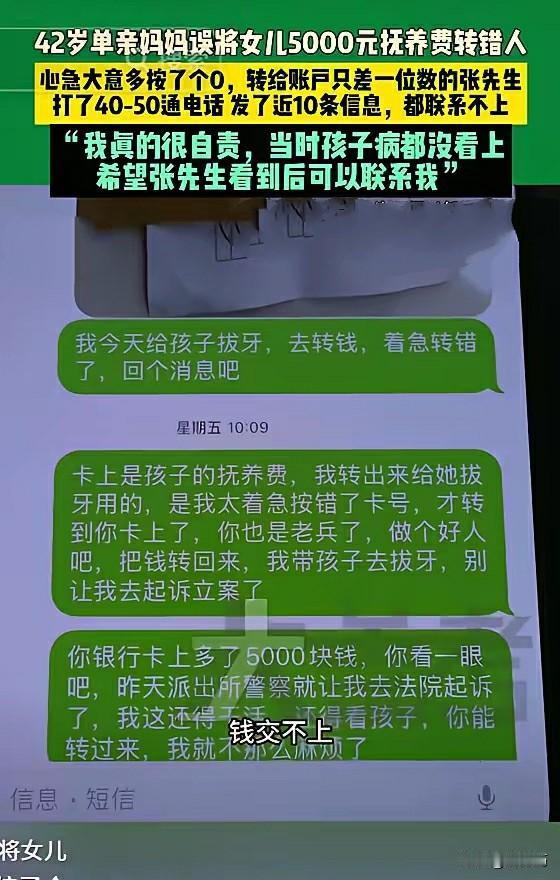 女子误操作,把给女儿看病的钱转到了别人的卡上,对方却保持沉默。 10月13日,河南郑州一位42岁单亲妈妈为自己做过的一件错事伤心不已。 原来,这位单亲妈妈独自一人领着自己的女儿生活,生活本就辛苦,更何况是一位亲妈妈。 前几天,这位妈妈的女儿因为牙齿的问题需要进行治疗。 看病得花钱,于是这位妈妈就打算把女儿卡上的抚养费,转到自己的卡上,再领女儿去看牙。 就在她用手机操作转账的时候,也是由于一时的疏忽,居然莫名其妙的把5000块钱打到了别人的卡上。 发现转错账之后,女子当时就着急了,她赶忙尝试联系对方,可是对方没回应。 接着她又给对方打了几十个电话,对方依旧是没有任何的回应。 这下女子傻眼了,她当时急得哭了起来,可是哭过一阵之后她又冷静下来。 接着她又给对方发去了两条信息,信息的大概内容就是表明自己是单亲妈妈的身份,然后用这个钱给女儿去看病。 但是消息发出去之后如石沉大海,依旧是一点回应都没有。 这时候女子已经放弃单独联系对方的想法了,她转而打电话报了警,可是民警建议女子去法院起诉对方。 一听要打官司,女子更心灰意冷了,因为她还要奔波忙碌、养家糊口,根本就没有时间去打这场官司。 越想越委屈的女子,最后实在是没办法了,她只得向当地的媒体诉说了自己的遭遇,希望媒体能帮到自己要回这个钱。 更让她心痛的是,因为钱转走了,自己手头还没有富余的钱去给女儿看牙。 每天看着女儿牙疼得痛苦的捂着脸,女子的心就如刀绞,她也只能伤心的哭着毫无办法。 其实这5000块钱对于一些人来说真不算什么,但是对于一个单亲妈妈来说,这个钱却不是一个小数目。 当媒体记者的镜头对着单亲妈妈的时候,单亲妈妈一边哭一边承诺,只要对方把钱返回来,自己会包个红包给对方作为感谢。 其实对方如果发现有人转错钱到自己的卡上之后,别管对方有钱没钱是啥人,第一时间就应该把这个钱返回去。 因为这个钱不属于自己,所以咱不能贪这个不义之财。 一旦有人藏私心把这个钱据为己有的话,人家如果被逼急了告到法院的话。 到那个时候,就得不偿失了,不止要返还本金,还要附带利息。银行转账转错了 钱款误转