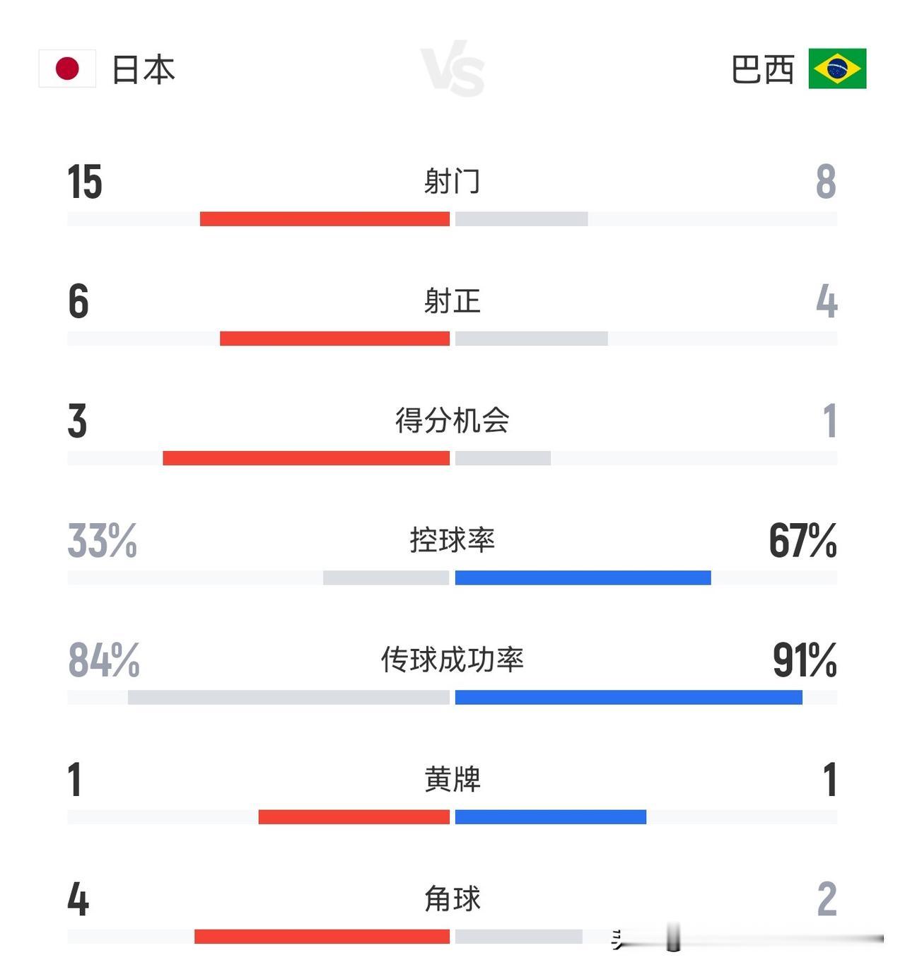 日本队史首次战胜巴西队,但我相信日本未来会经常战胜巴西队。 没看比赛的很多球迷可能认为这场比赛是不是巴西发挥失常,是不是日本队运气好,但看了比赛的我告诉你,这场比赛日本足球踢出来的内容会让你大吃一惊,日本队真的是凭实力战胜巴西队。 落后时他们不急不躁,但眼神有光,日本队员的那种从容、自信、对比赛的全神贯注让人相信他们会创造奇迹。 比赛的数据也说明一切,进攻威胁度日本远胜于巴西,全场射门15次6次射正,全部高于巴西队,虽然控球率没有巴西队多,但下半场日本队高位逼抢巴西队,皮球大部分时间都在巴西队的半场。 虽然不喜欢日本,但真的佩服日本足球,他们提出赢得世界杯冠军并不是喊口号,是来真的!