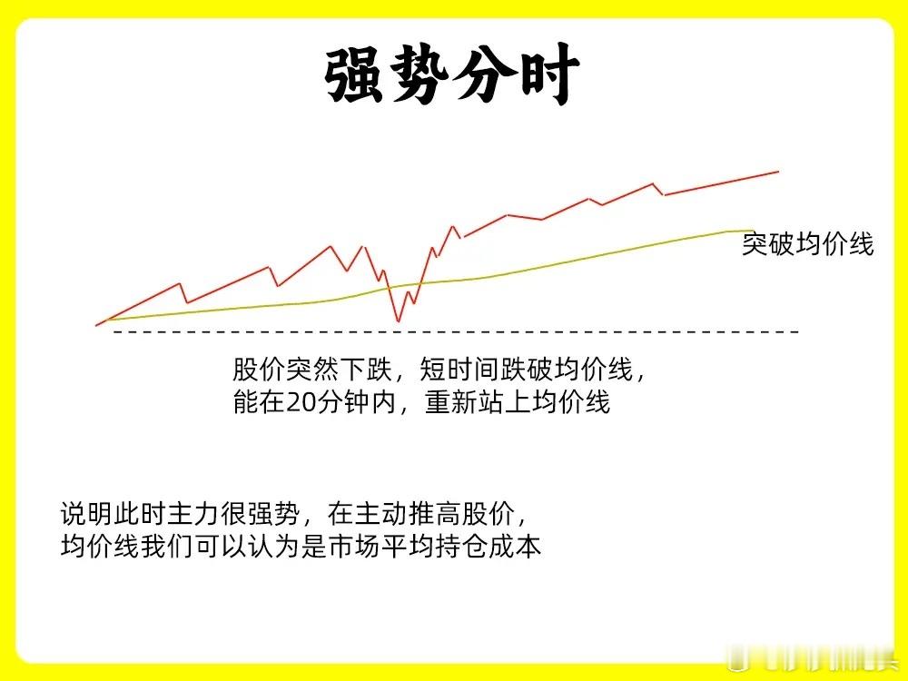 股价开盘以后就沿着均价线一路上涨,全天都没有跌破分时均价线,说明此时主力很强势,在主动推高股价,均价线我们可以认为是市场平均持仓成本,它斜率向上,成本在增加,尾盘也没有出现跳水走势,就可以认为是强势分时。当然,如果上涨趋势里,股价突然下跌,短时间跌破均价线,能在20分钟内,重新站上均价线,也是强势。看多