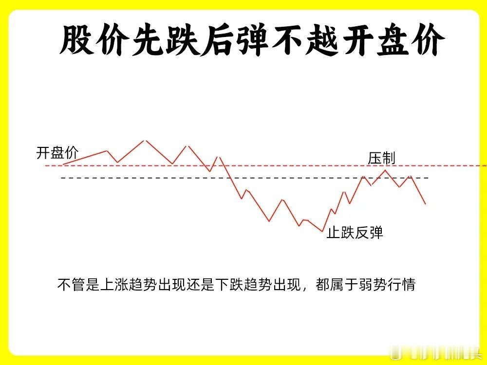 这是明显弱势行情,股价在尾盘出现大幅下跌,虽然有反弹向上,到了收盘,都没突破开盘价。在分时图中,开盘价,最高价,最低价和均价线,都一些短期的关键位置。反弹不突破均价线,说明市场比较弱,往往成交量表现也是一般。不管是上涨趋势出现还是下跌趋势出现,都属于弱势行情
