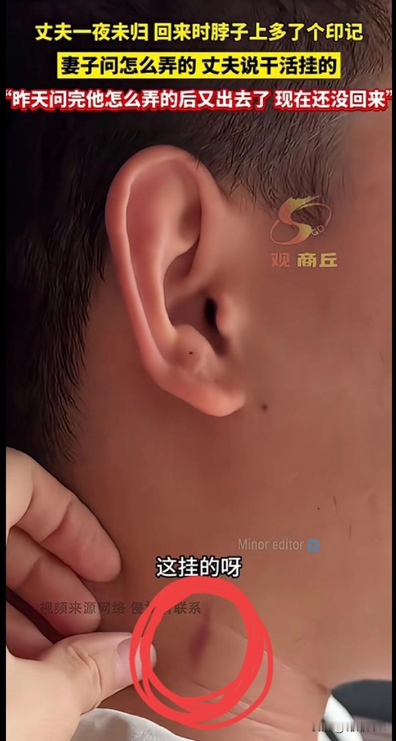 家人们快看这操作,简直离谱到家了!一丈夫一夜没回来,脖子上多了个印记,妻子问他咋弄的,他居然说“干活挂的”😅 关键是昨天问完,他又出去了,现在还没回来! 这“挂的”理由也太敷衍了吧,谁干活能挂出这么个印记啊?明眼人都看得出来咋回事儿。这丈夫是把妻子当傻子哄呢?婚姻里最忌讳的就是欺骗和隐瞒,这要是真有啥情况,趁早摊牌不好吗? 姐妹们,你们觉得这事儿能信吗?要是你们遇到这种情况,会咋处理?快在评论区聊聊!
