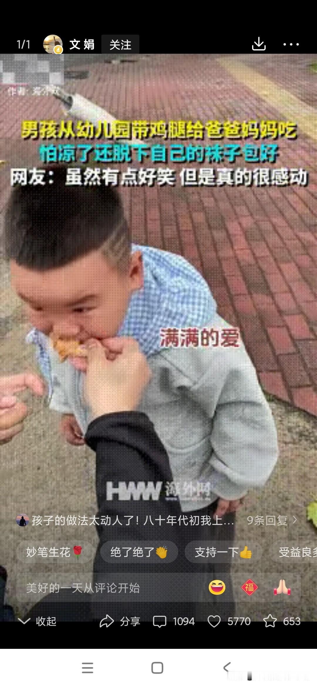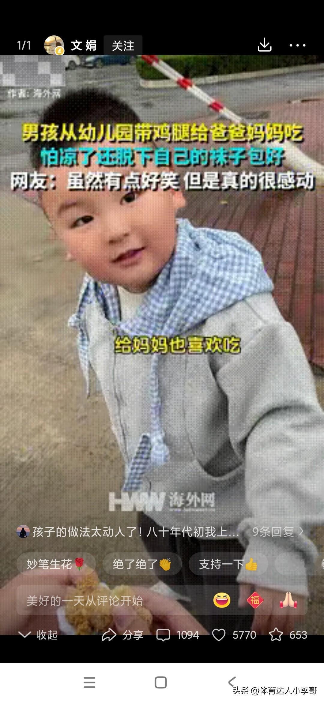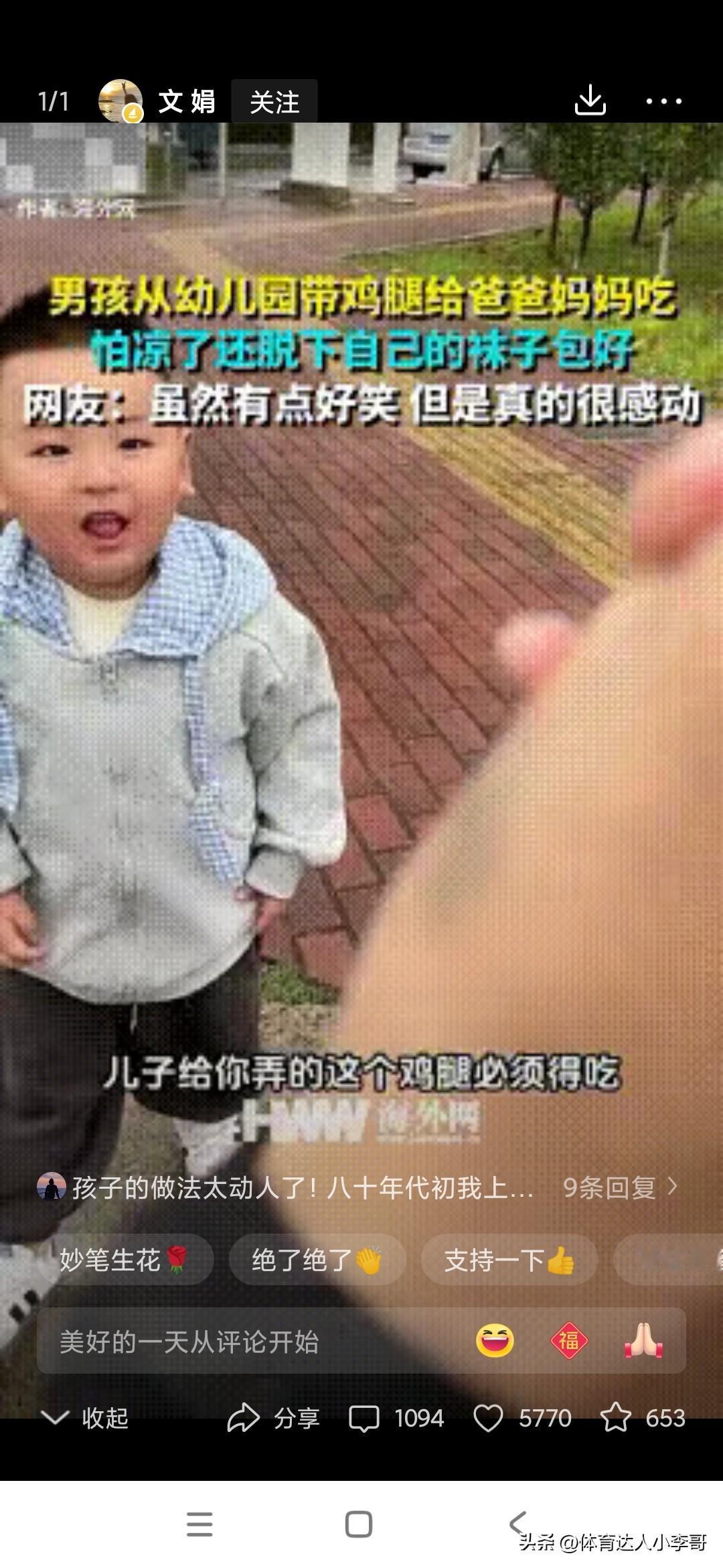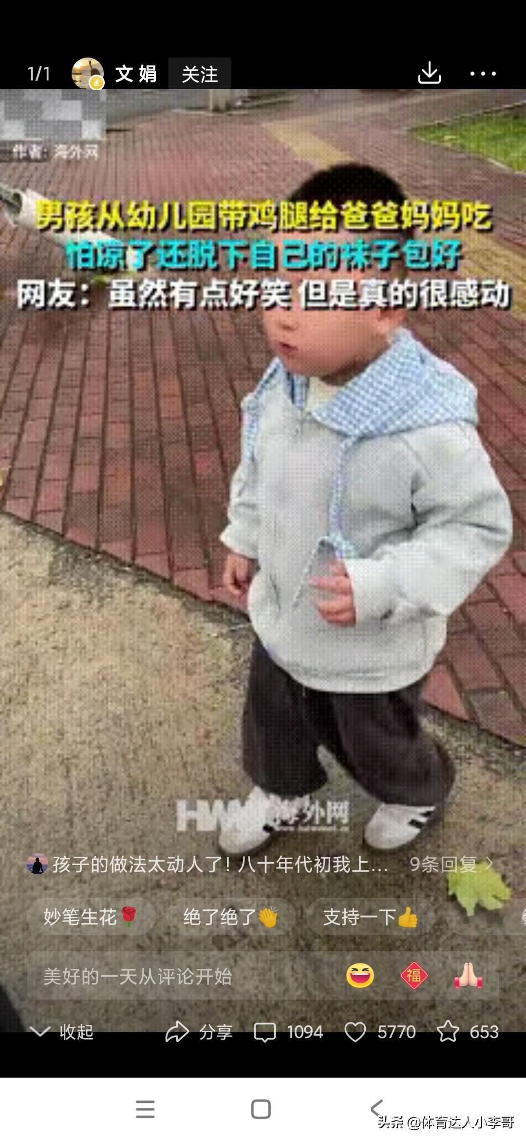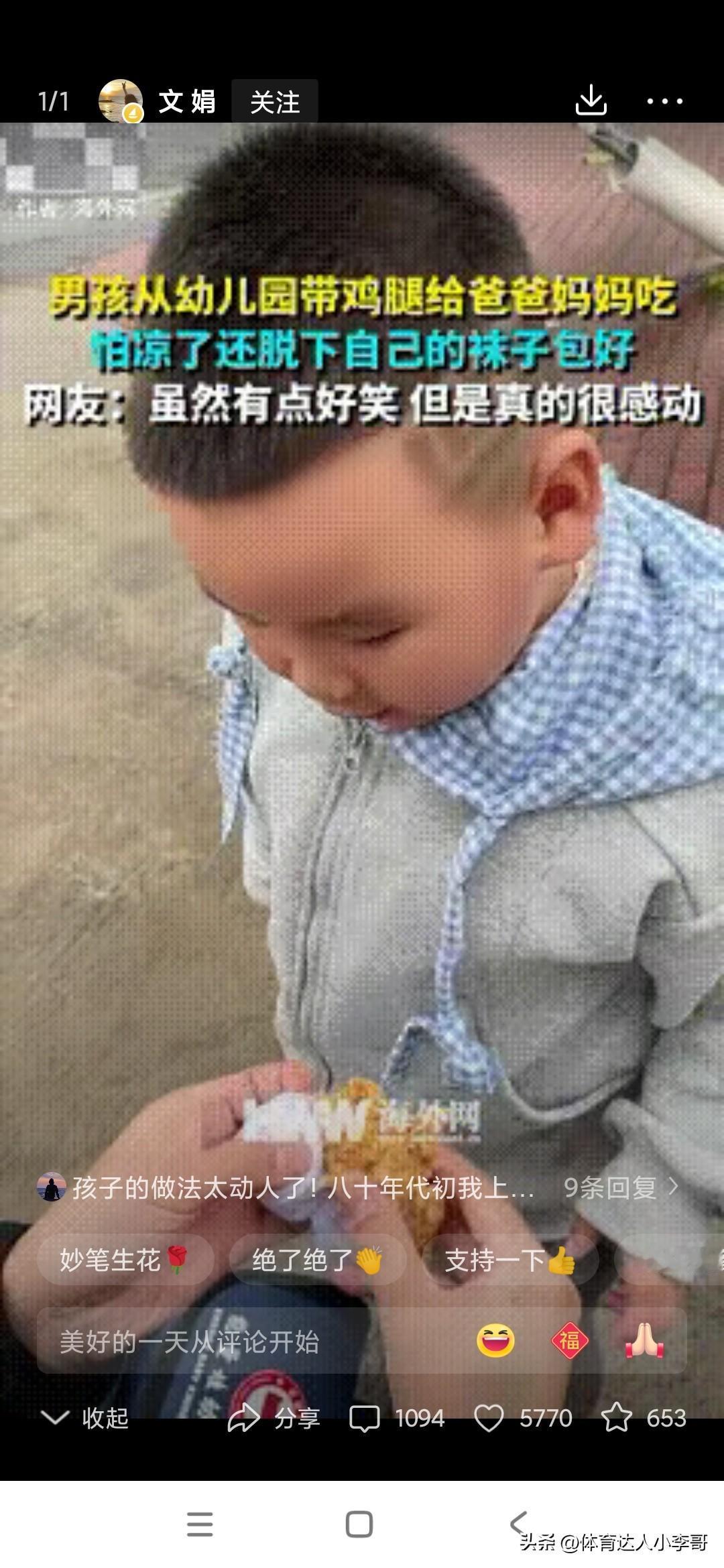 我现在仍然记得当我的外甥叫我老妹妈妈的时候,我的老妹有多么开心,多么激动,所以说我可以理解这家孩子用袜子带了一个鸡腿儿给爸爸妈妈,他们有多么开心和欣慰,而且把鸡腿从袜子里拿出来,爸爸一口,妈妈一口,还给儿子一起分享,儿子可能什么也不懂,但是这一刻其实确实是温馨到太多的人了,人民日报都转载了,这就是家庭和爱的意义吧,所以说年轻人还得生孩子呀,不生孩子的话,有些情感你是没有办法感觉到的!