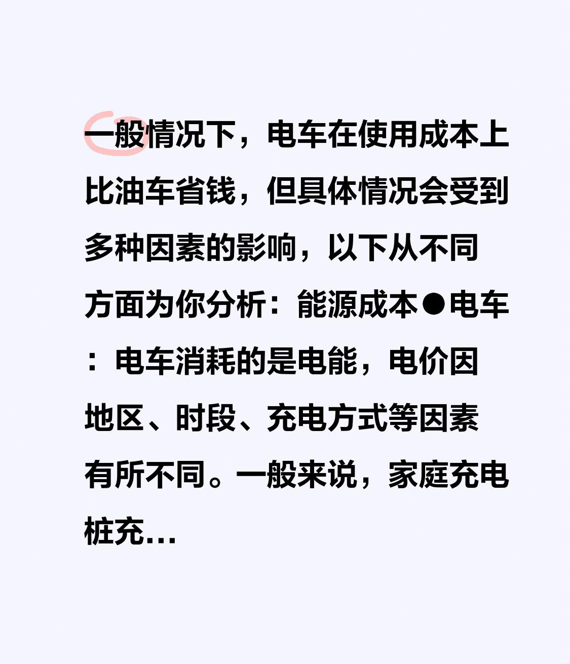 一般情况下,电车在使用成本上比油车省钱,但具体情况会受到多种因素的影响,以下从不同方面为你分析: 能源成本 ●电车:电车消耗的是电能,电价因地区、时段、充电方式等因素有所不同。一般来说,家庭充电桩充电价格相对便宜,每度电在0.5 - 0.8元左右。以一辆续航500公里、电耗15度/百公里的电车为例,行驶500公里的电费大约为37.5 - 60元。 如果使用公共充电桩,价格会稍高,每度电在1.5 - 2元左右,行驶500公里的电费约为112.5 - 150元。 ●油车:油车使用的是汽油或柴油,油价会随市场波动。以汽油为例,目前每升价格大约在7 - 9元。一辆油耗为8升/百公里的油车,行驶500公里的油费大约为280 - 360元。 由此可见,在能源成本方面,电车通常比油车更省钱。 保养成本 ●电车:电车的结构相对简单,没有复杂的发动机、变速器等部件,保养项目主要包括电池检测、电机维护、制动系统检查等,保养周期也相对较长。一般来说,电车的保养费用相对较低,每次保养费用可能在几百元左右。 ●油车:油车的保养项目较多,包括更换机油、机滤、空滤、火花塞等,保养周期相对较短。随着车辆使用年限的增加,还可能需要进行发动机大修等高额维修项目。油车的保养费用相对较高,每次保养费用可能在一千元左右,甚至更高。 其他成本 ●购车成本:目前市场上,同级别、同配置的电车和油车相比,电车的价格可能会稍高一些。这是因为电池等核心部件的成本较高。不过,随着技术的进步和规模效应的显现,电车的价格正在逐渐下降。此外,一些地区为了推广新能源汽车,会给予电车一定的购车补贴,这在一定程度上降低了电车的购车成本。 ●电池更换成本:电车的电池使用寿命有限,一般在8 - 15年左右。如果电池出现严重衰减或损坏,需要更换电池,这将是一笔不小的费用。不过,目前很多车企都提供了电池保修政策,在一定程度上降低了用户的担忧。 ●保险成本:由于电车的维修成本相对较高,尤其是电池等核心部件的维修费用昂贵,所以电车的保险费用可能会比油车略高一些。 综上所述,在日常使用过程中,电车的能源成本和保养成本通常比油车低,总体上更省钱。但在购车成本、电池更换成本和保险成本等方面,电车可能存在一些额外的支出。因此,在选择购买电车还是油车时,需要综合考虑自己的使用需求、预算、使用环境等因素。电车用车感受 新能源车成本 电车能耗 电车用电成本 电车省钱 电车省钱秘诀 油电成本大比拼