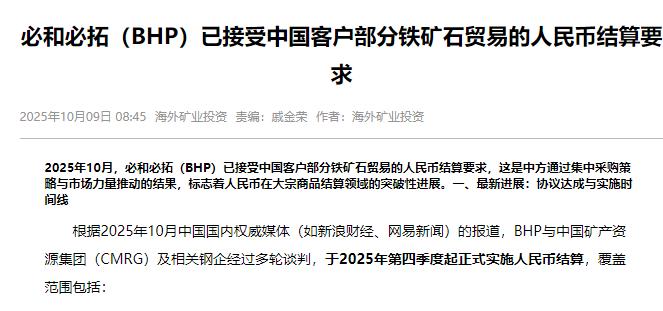 澳大利亚前脚答应对华出口铁矿石使用人民币结算,可后脚就打算和美国签下关键矿产协议,还准备为新稀土项目提供资金支持。 铁矿石人民币结算这事儿可不是突然发生的,早年间国际铁矿石贸易就是块被美元和四大矿企攥死的肥肉,必和必拓、力拓这些澳洲巨头拿着成本仅15美元/吨的矿石,常年以超100美元/吨的价格卖给中国。 2024 年力拓更是把 62% 品位的矿石炒到了 215 美元一吨,这利润差都快十倍了,比卖芯片还暴利。更气人的是,他们还玩区别定价,2021 年铁矿石价格明明在跌,给国内不同钢企的报价能差出 10%,就怕咱们抱团议价。 最憋屈的是中国钢企,2024 年全年辛苦下来,平均炼一吨钢才赚 30 块钱,还不够买杯奶茶,数十万工人忙活一年,倒成了澳洲矿企的打工仔,而必和必拓光上半年净利润就有 102 亿美元,这钱赚得也太轻松了。 这一切的根源除了矿企垄断,就是美元结算的霸权。全球 90% 以上的大宗商品都用美元计价,铁矿石自然也逃不掉。 2022 年美元一升值 10%,就算矿石本身没涨价,中国企业的采购成本平白就多了 10%,等于是被矿价和汇率两头薅羊毛,每年光冤枉钱就得花上百亿。 美元绑定大宗商品贸易,这才是美国金融霸权的根基,而澳大利亚就是靠着这层关系,吃了中国几十年红利 。 2024 年澳大利亚对华出口铁矿石 7.4 亿吨,占了中国进口量的 60%,铁矿石出口更是占了澳洲总出口的 40%,说中国养着澳洲矿业一点不为过。 铁矿石人民币结算绝不是突然的妥协,早从 2019 年就有苗头了。当年澳洲的 FMG 公司就在中国设了贸易公司,开始用人民币卖矿石,必和必拓也在 2020 年和宝武集团试过水,做了一笔 1 亿元的人民币结算订单。 但那时候澳洲矿企根本没当回事,必和必拓还嘴硬说美元销售才是主力,人民币只是补充。真正让他们低头的,是中国这几年实打实的破局行动。 2022 年中国成立了矿产资源集团,把全国 40% 的铁矿石采购需求整合到一起,终于从 “一盘散沙” 变成了 “铁拳”,有了跟巨头叫板的资本。 更关键的是中国找好了后路,不再把鸡蛋放一个篮子里。几内亚的西芒杜铁矿已经投产了,这可是全球最大的优质铁矿,储量超 50 亿吨,品位能到 67%,每年 1.2 亿吨的产量直接就能帮中国减少对澳矿的依赖。 加上秘鲁、喀麦隆的新项目,还有国内电炉炼钢用的废钢替代比例已经到了 18%,澳洲矿企的垄断优势越来越弱。 2025 年 10 月初,中国干脆停了必和必拓所有美元计价的订单,放出话来:要卖矿可以,必须用人民币结算。必和必拓一开始还硬气,可短短十天就服软了,毕竟丢了中国市场,他们的矿山就得停产,这损失谁也扛不住。 可谁能想到,这边刚答应人民币结算,那边就忙着跟美国勾连关键矿产协议,这翻脸速度比翻书还快。澳洲计划砸 12 亿澳元,差不多 57 亿人民币,联合美国搞稀土、锂、钴这些矿产的战略储备,还想设价格下限机制,说白了就是想跟中国抢话语权。 他们找了必和必拓、力拓还有专门搞稀土的莱纳斯公司闭门磋商,莱纳斯甚至拿出了改良的萃取技术,哄着政府给钱建本土精炼厂。 这 12 亿澳元里,稀土是重点,光钕铁硼永磁体需要的镨钕氧化物,就想储备全球年消费量的 15%,野心大得很。 澳洲这么做,说到底就是看稀土比铁矿石更有前途,想抱美国的大腿分一杯羹。现在全球 90% 以上的稀土精炼产能都在中国,美国急着要打破依赖,《通胀削减法案》里对矿产来源卡得死死的,澳洲正好凑上去当 “替代品”。 他们心里的小算盘打得精:铁矿石还得靠中国赚钱,毕竟中国市场丢不起;但稀土、锂这些新能源急需的矿产,跟着美国搞 “西方矿产联盟”,既能拿补贴,又能当规则制定者,简直是两头占便宜。 可他们忘了,中国能逼得必和必拓低头,自然也有办法应对稀土领域的博弈。澳洲稀土就算储量大,可精炼技术跟不上,短期内根本绕不开中国的产业链,现在跳得欢,将来恐怕还是得求着中国合作。 其实澳洲这种投机行为早就有苗头,一边赚着中国的真金白银,一边跟着美国搞小动作。 但他们也清楚,铁矿石是自己的经济命脉,2024 年对华出口 796.3 亿美元,这钱要是没了,澳洲经济就得崩;可又怕在战略上被美国抛弃,想在关键矿产上表忠心。 这种又想当又想立的做法,根本长不了。中国现在已经在巴西、俄罗斯的贸易里推进人民币结算,铁矿石只是开始,等越来越多大宗商品不用美元,澳洲再想两头下注可就没那么容易了。 说到底,这个世界还是看实力说话。中国能让澳洲矿企妥协用人民币结算,靠的是整合采购的底气、开拓新矿的布局,还有基建和工业的硬实力。 澳洲想靠着美国在关键矿产领域翻盘,恐怕只是一厢情愿。毕竟真金白银的生意没人愿意丢,可跟着美国搞阵营对抗,最终只会搬起石头砸自己的脚。