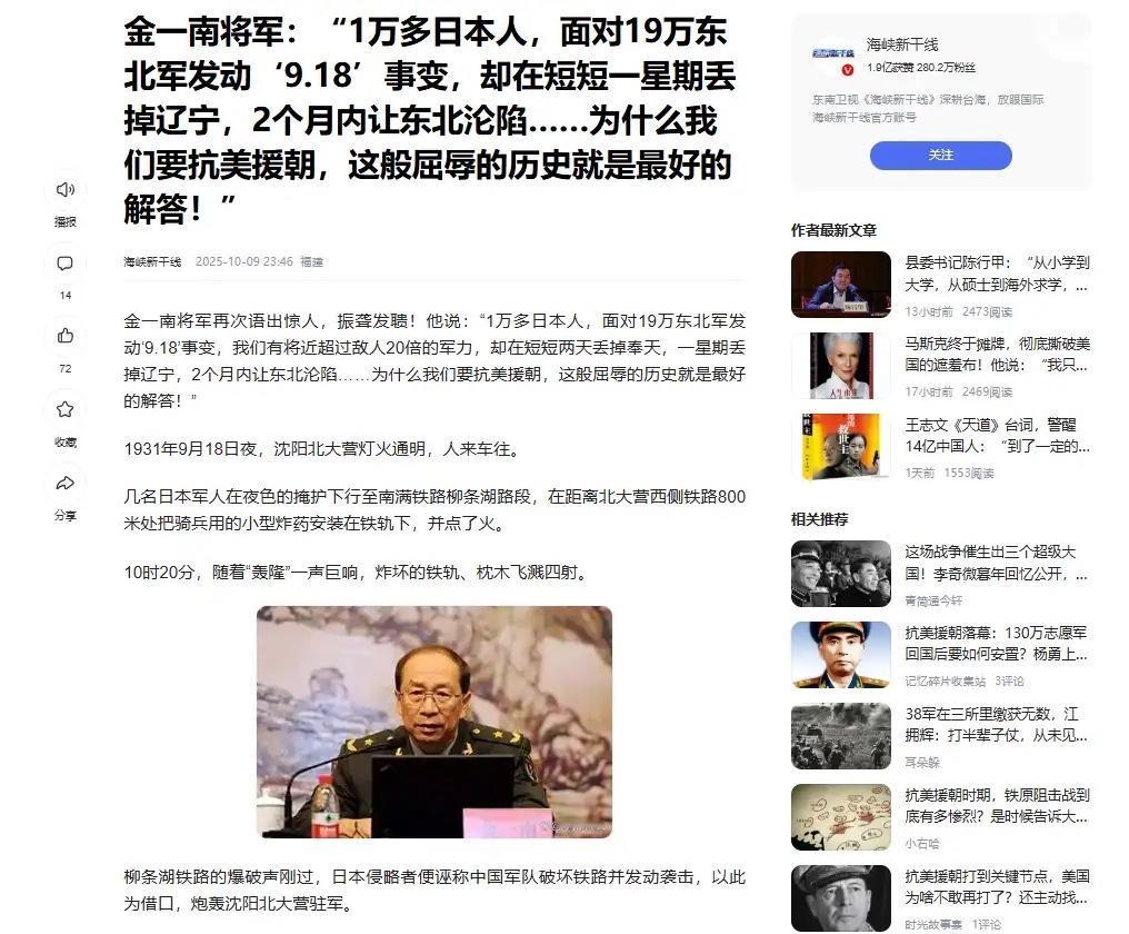 金一南将军再次语出惊人!他说:“1万多日本人,面对19万东北军发动‘9.18’事