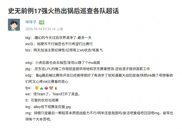 直播吧10月15日讯在S15入围赛IG不敌T1后,豆瓣网友整理了各个战队超话的舆论环境以及IG超话的分锅环节;