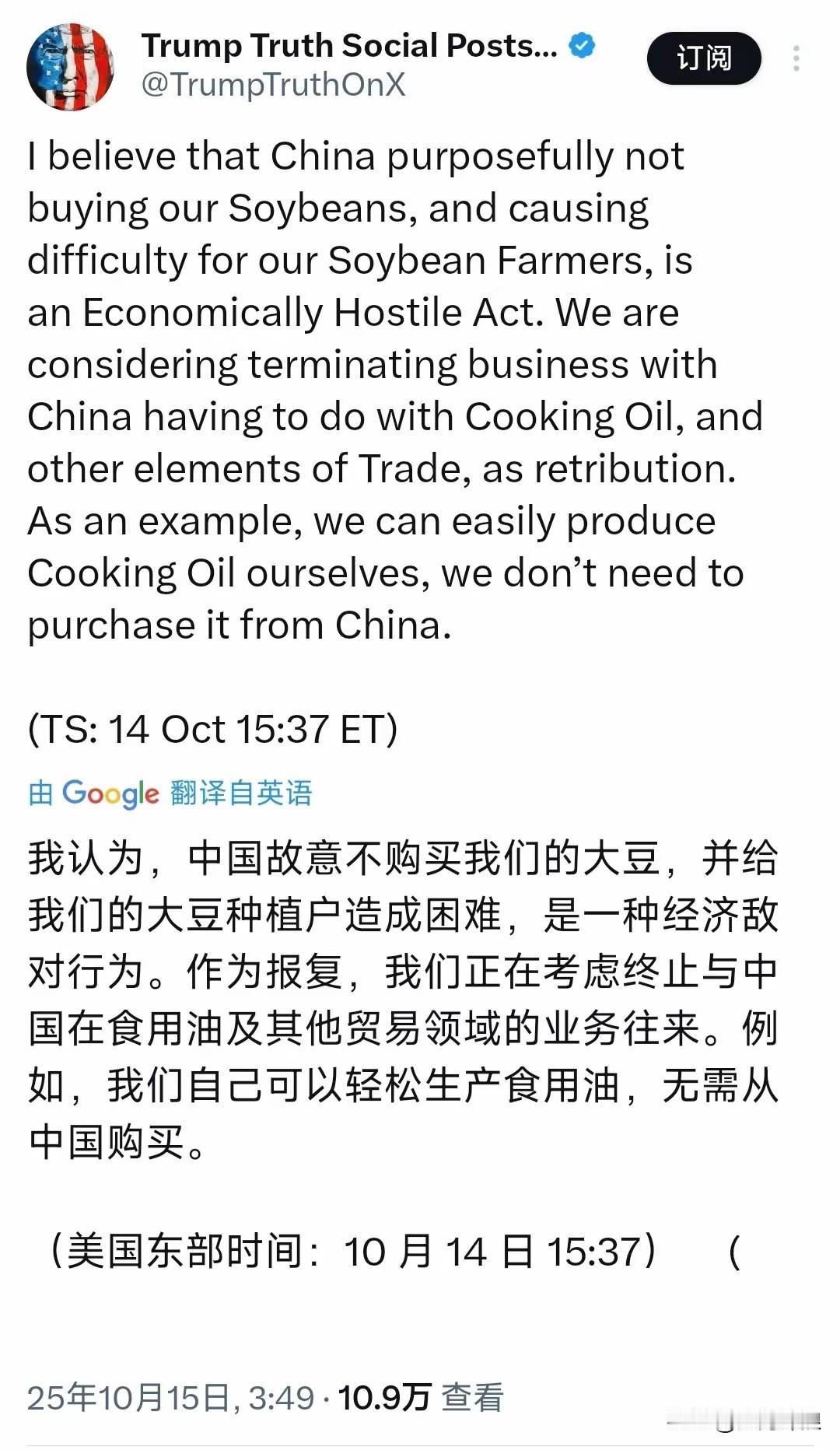 美国总统特朗普最新表态! 特朗普说 中国不购买我们的大豆 我们就不购买 中国的食用油 文海冲浪点评 特朗普先生 你真逗 你说 中国不买你的大豆 你就不买 中国的食用油 你呀 有点黔驴技穷了 你怎么不想想 中国为什么 不买你的大豆 原因在哪里 是谁造成的 再说 你不买中国的食用油 这有什么 你美国买的中国食用油 在国际市场上 能占几何 太微不足道了