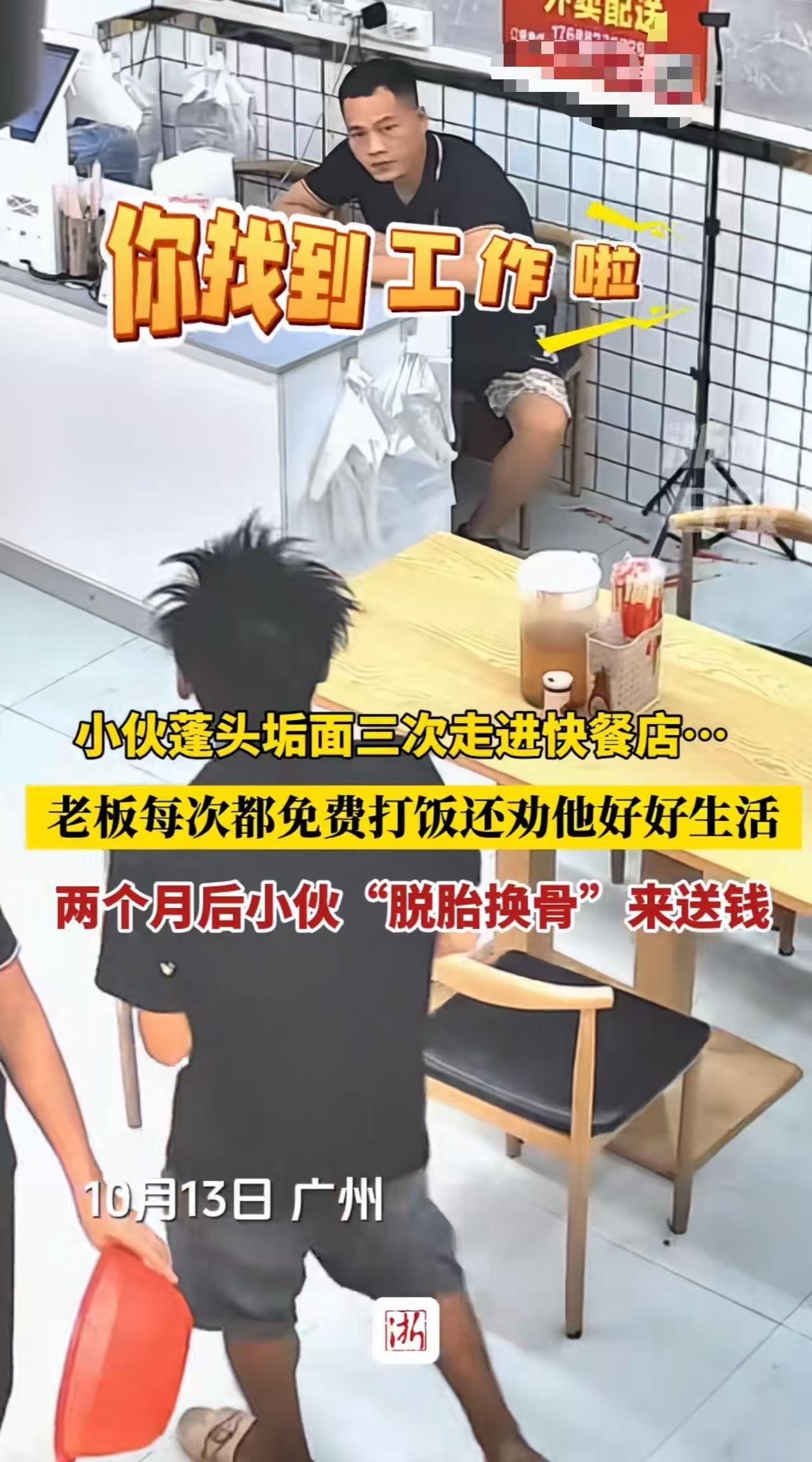“这就是帮助他人的意义!”小伙蓬头垢面三次来餐馆求助,老板每次都免费给他饭吃,劝他收拾好自己找个工作!两个月后,小伙“脱胎换骨”来到店里,老板差点认不出来,而小伙做法,更是让人意想不到! (来源:浙江日报) 今年7月,一位衣衫褴褛、蓬头垢面的小伙走进了店里。他厚着脸皮对店主罗女士说自己饿了,想吃饭,可身上却没有一分钱。 罗女士的丈夫见状,没有丝毫犹豫,立刻给他打了一份热气腾腾的饭菜。 小伙接过饭,狼吞虎咽地吃了起来。罗女士在一旁看着,心中满是怜悯,关切地问他饭菜还够不够?又给小伙加了菜。 吃完后,小伙一脸感激地离开了,那眼神中,似乎多了一丝对生活的希望。 一段时间后,小伙再次出现在店里。罗女士和丈夫依旧热情地为他提供了饭菜。 这一次,罗女士忍不住问小伙是不是遇到了什么困难,这么年轻力壮,为什么不去找份工作呢?毕竟凭借自己的双手,总能赚钱养活自己啊。 小伙当时只是默默地点点头,没有多说什么,便又离开了。但从他的眼神中,能感受到他似乎在思考着什么。 今年8月,小伙又一次来到店里,这次他是向罗女士索要一个米袋。罗女士心中暗自猜测,他是不是想要捡废品来谋生。 于是,她再次耐心地劝说小伙,让他把自己收拾干净,去找一份更稳定、更有前途的工作。毕竟,人生还有很长的路要走,不能一直这样浑浑噩噩下去。 让罗女士和丈夫万万没想到的是,10月13日,小伙穿得干干净净、整整齐齐,骑着自行车精神抖擞地重新来到了店里。 此时的他和之前那个“流浪汉”判若两人,罗女士和丈夫差点没认出来。 直到小伙热情地向他们打招呼,他们才确定眼前这个帅气、阳光的小伙就是当初那个落魄的求助者。 罗女士的丈夫看到小伙的变化,由衷地为他感到高兴,连忙问道:“你找到工作了?” 小伙微笑着点点头,然后从口袋里掏出100块钱,真诚地表示感谢。 罗女士的丈夫连忙拒绝说不用了,可小伙放下钱就迅速离开了,仿佛害怕再多停留一秒,这份感激之情就无法完整地表达。 那一刻,罗女士和丈夫心中涌起一股暖流,他们真切地感受到了帮助人的意义!他们的三顿饭和几次真诚的鼓励,就像三把神奇的钥匙,打开了小伙心中那扇通往新生活的门,改变了小伙的一生! 此事引发热议,有网友说,老板看到他来,嘴角都压不住,不是怕他又来白吃,而是看他穿的干净得体,为他高兴,是刻在骨子里的善良! 也有网友说, 收下吧,那是你给他的肯定,也是他自己找回尊严的方式,不再是流浪汉! 还有网友说,出门在外,有些时候陌生人的一句关心或者是一句开导的话,真的很有穿透力的! 罗女士和丈夫的帮助,如同一束温暖的光,照亮了人与人之间最纯粹的情感。 他们给的不是饭,是活下去的尊严和对未来的光,以及人与人的温暖和爱! 有时候,一个小小的善举,就能成为他人生命中的转折点。在生活的舞台上,总有一些平凡而伟大的故事,让我们深刻领悟到善良与关爱的力量!