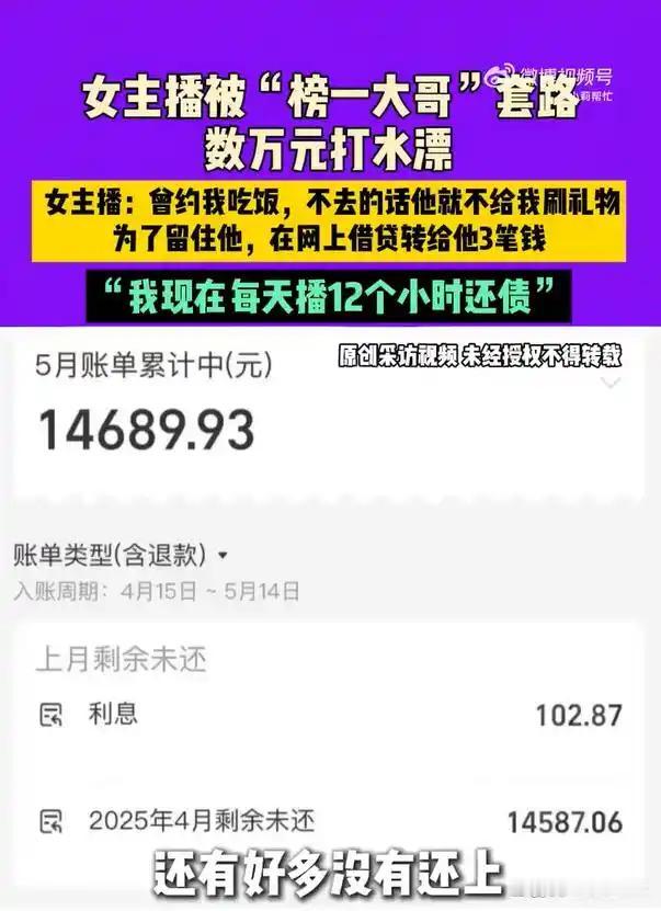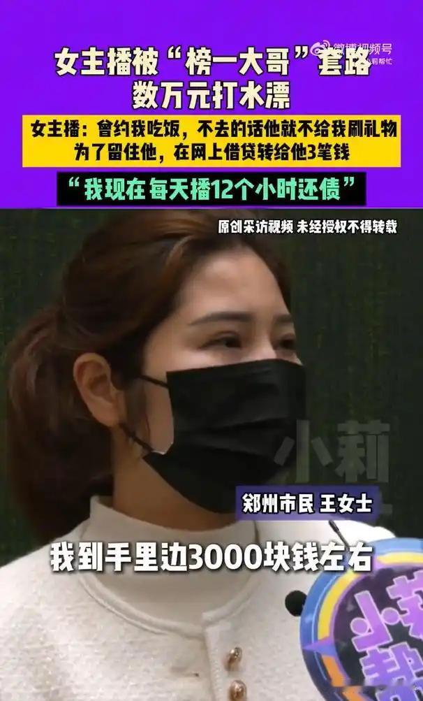如今网络骗局防不胜防,郑州女主播王女士就吃了个大苦头。她做主播还不到20天,就碰到一位出手阔绰的榜一大哥。仅仅一星期,就让她赚了3000多元。大哥随后约她线下见面,见面后两人关系愈发亲近,大哥便以做生意为由开始向她借钱。王女士先是用花呗借了1万,接着又借了2.5万、2.1万,前前后后总共借出去5.6万。然而,大哥却突然消失得无影无踪,王女士只能每天直播12小时来替他还钱。本想着放长线钓大鱼,没想到落得个赔了夫人又折兵的下场。这也给大家敲响了警钟,网络交友务必要谨慎,千万不能随意借钱! 网上骗局 讲真骗局 直播间超级骗局 流行骗局 聊天主播骗局 主播骗局 主播是骗子