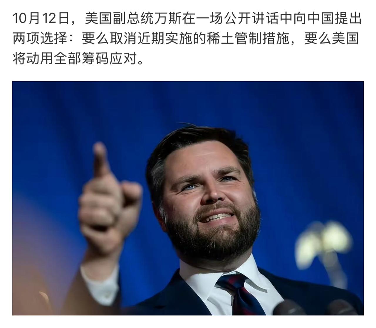 美国副总统万斯:要么中国取消稀土管制,要么美国将动用全部筹码应对! 好怕怕哦