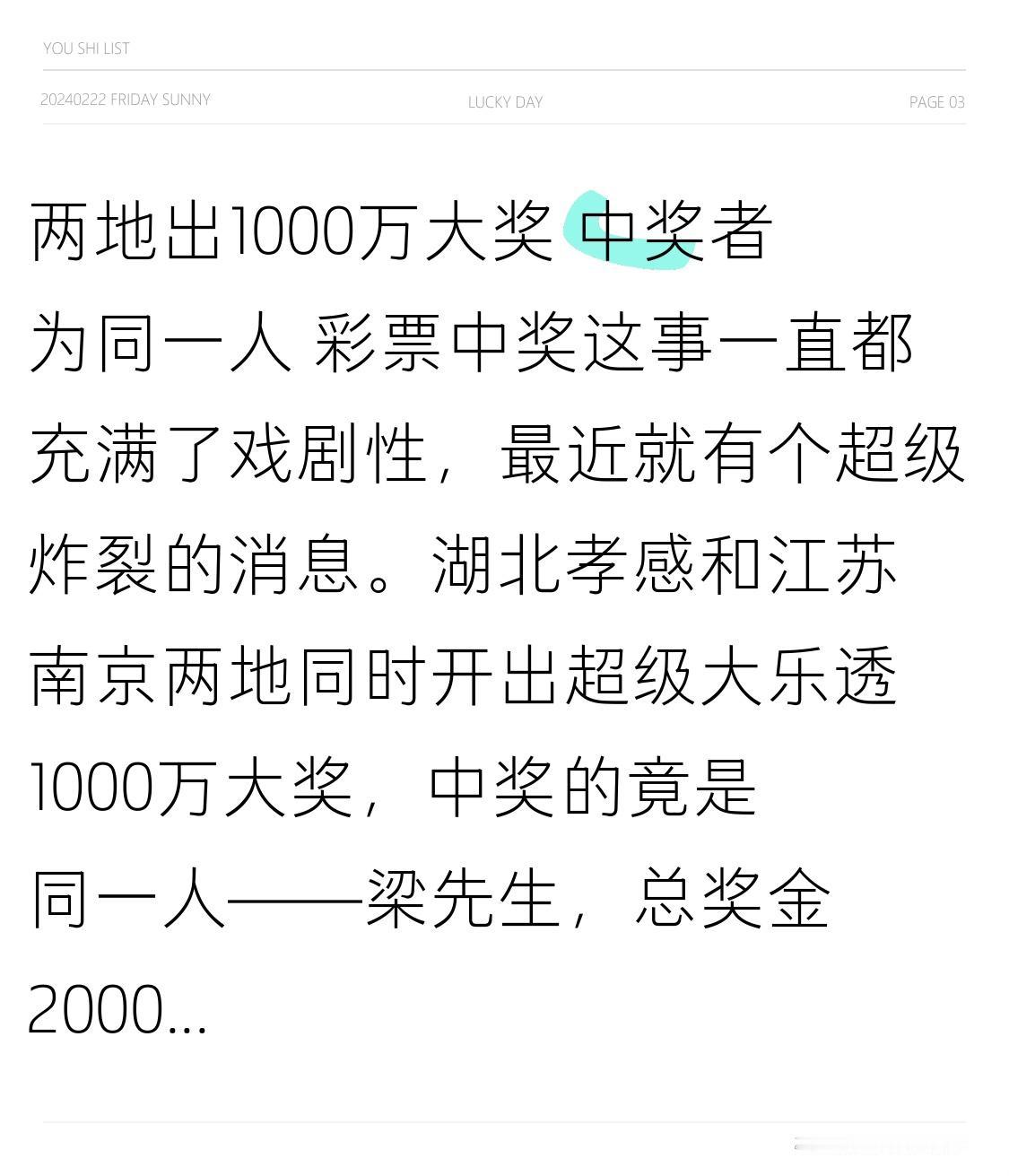 两地出1000万大奖 中奖者为同一人 彩票中奖这事一直都充满了戏剧性,最近就有个超级炸裂的消息。湖北孝感和江苏南京两地同时开出超级大乐透1000万大奖,中奖的竟是同一人——梁先生,总奖金2000万! 梁先生是个彩票迷,工作忙没法每期都买,就一直守着一组号,一次买几十期。他和姐姐约定,姐姐在湖北用相同号码帮他买。结果2025年10月这期,两地都中了。全国才7个一等奖,他独中俩,简直是“天选之人”。 10月9号他先去南京领奖,隔天又飞湖北和姐姐一起领。工作人员和记者都围过来,他第一次领奖兴奋又紧张,第二次都有点习惯了。这运气,让人直呼羡慕!