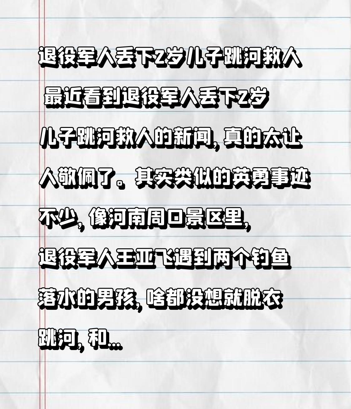 退役军人丢下2岁儿子跳河救人 最近看到退役军人丢下2岁儿子跳河救人的新闻,真的太让人敬佩了。其实类似的英勇事迹不少,像河南周口景区里,退役军人王亚飞遇到两个钓鱼落水的男孩,啥都没想就脱衣跳河,和岸边群众一起把孩子救上来,整个救援几分钟就完成,孩子只是受了惊吓。还有湖北的张万里,骑车路过看到孩子落水,不顾右臂有伤,丢下东西狂奔百米跳水救人,河深且岸有青苔,他几次托举才成功。这些退役军人在危急时刻冲锋在前,他们用行动诠释了责任与担当,太让人感动!