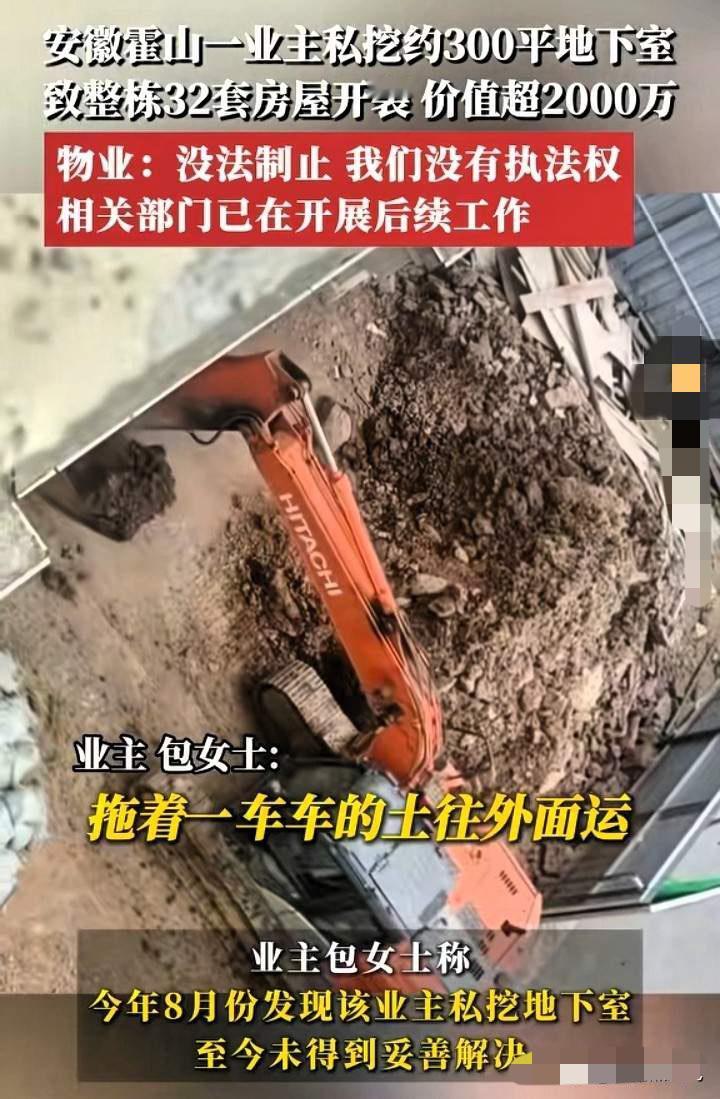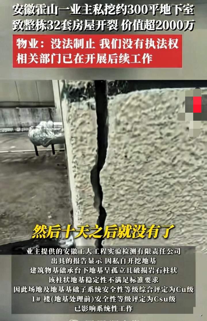 天没塌,但32户人家的家真的要塌了! 安徽霍山那小区,就因为一个邻居的自私,2000万的房子全成了危房,这事儿想想都让人冒火。 一楼业主黄某 是真够狠的,为了多占点空间,围着房子搞3米高遮挡,白天挖地、晚上运土,偷偷挖出个4.3米深、300平的地下室,直接挖到了楼的地基承台! 外墙裂得像蜘蛛网,顶楼渗水、邻居家大理石窗台都断了,他居然还接着装修,完全不管整栋楼的死活。 现在好了,房子成了C级危房,32户想维权都没处找:黄某 没钱赔,物业说没执法权只能上报。这哪是遇上个坏邻居,简直是遇上颗“定时炸弹”!
