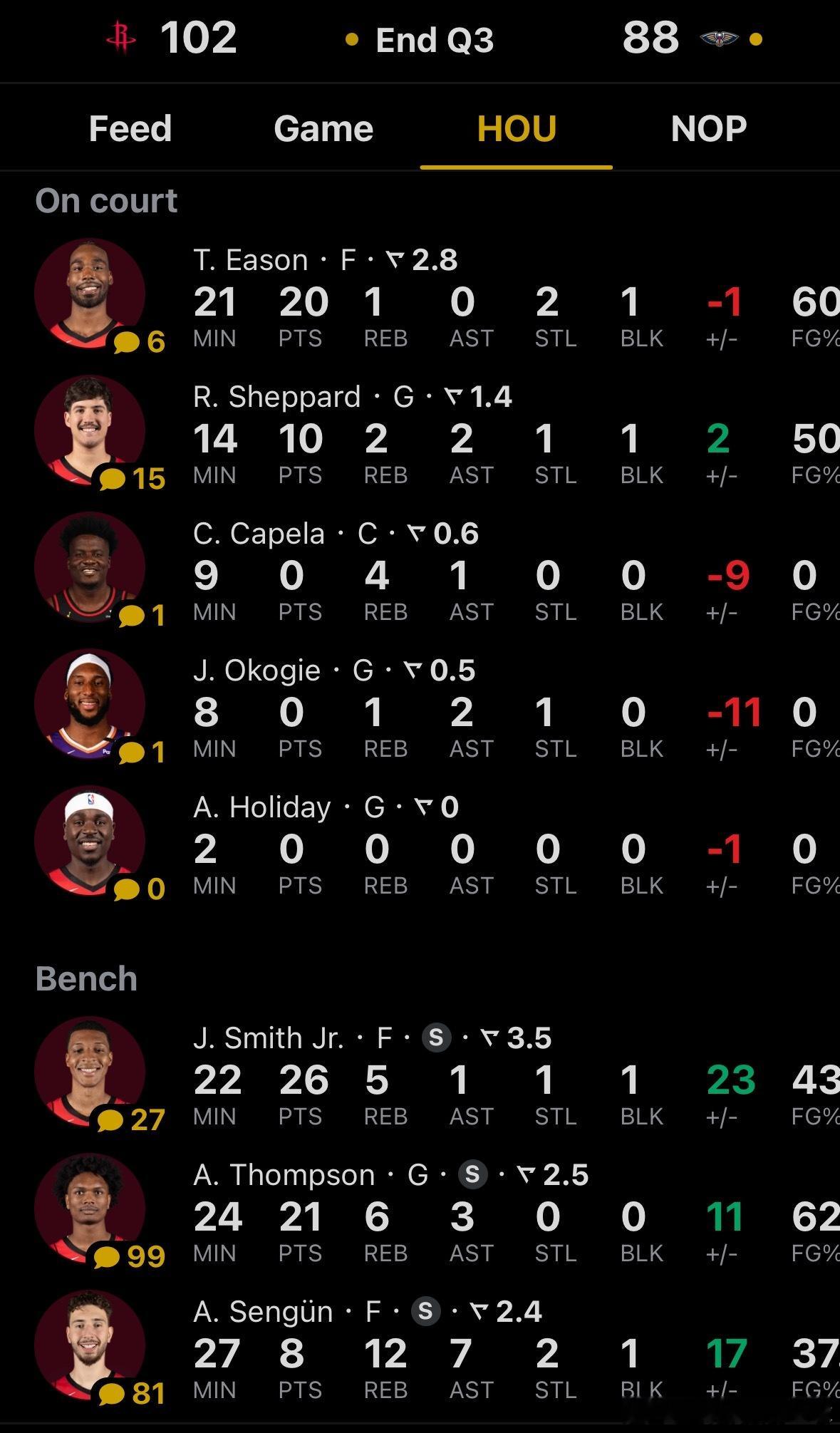 三节结束,火箭102比88领先鹈鹕🔥贾巴里26分,阿门21分,伊森20分,阿杜