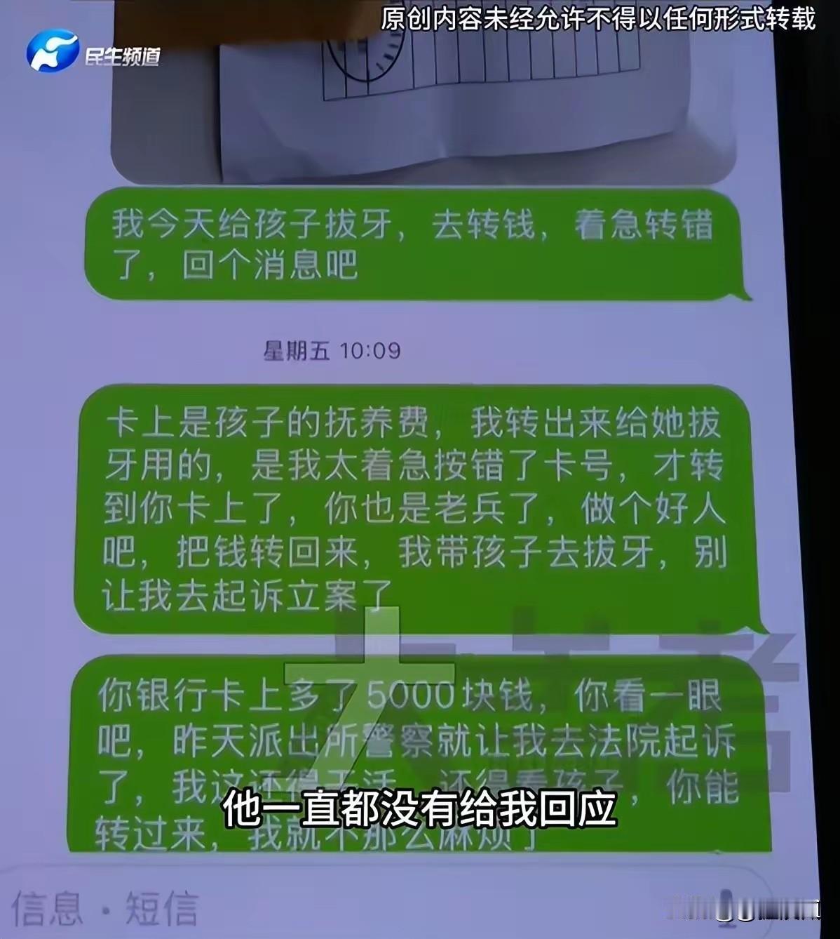 那个深夜,河南郑州一位42岁的单亲妈妈在ATM前颤抖着双手一遍遍核对转账记录。本该将前夫给的500元抚养费转到自己卡上给孩子看病,却因心急如焚多按了个“0”,5000元医疗费瞬间汇入陌生账户——对方账号只与她的账户相差一位数字。 “孩子还等着看病......”她哽咽着说。此后三天,她拨出40多通电话,发出近10条恳求短信,全部石沉大海。每通未接来电都像重锤敲在她心上:“我真的很自责,当时孩子病都没看上。” 这笔钱是她省吃俭用攒下的全部积蓄。作为单亲妈妈,每分钱都浸透着汗水与泪水。她通过媒体哽咽呼吁:“张先生,您可能还没注意到这笔转账,但这真是孩子的救命钱......” 律师指出:根据《民法典》第九百八十五条,这笔误转的5000元属于“不当得利”,收款人张先生负有返还义务。建议首先通过银行获取对方准确信息,若协商无果可向人民法院提起诉讼。律师提醒,不当得利若拒不归还,可能面临法律强制执行甚至纳入失信名单。 我们理解张先生或许尚未察觉这笔意外来款,但诚盼这份呼唤能传达到您耳边。五千元在有些人看来不算巨款,却是支撑一个单亲家庭的全部希望。这不仅是法律规定的义务,更是人心向善的选择——不该属于我们的钱财,握在手中只会灼烧良知。 很多人说这个报警警察会让你起诉,如果起诉对方,对方一直不给会脱很久,所以当你看到这位妈妈发出的求救,应该怎么办呢