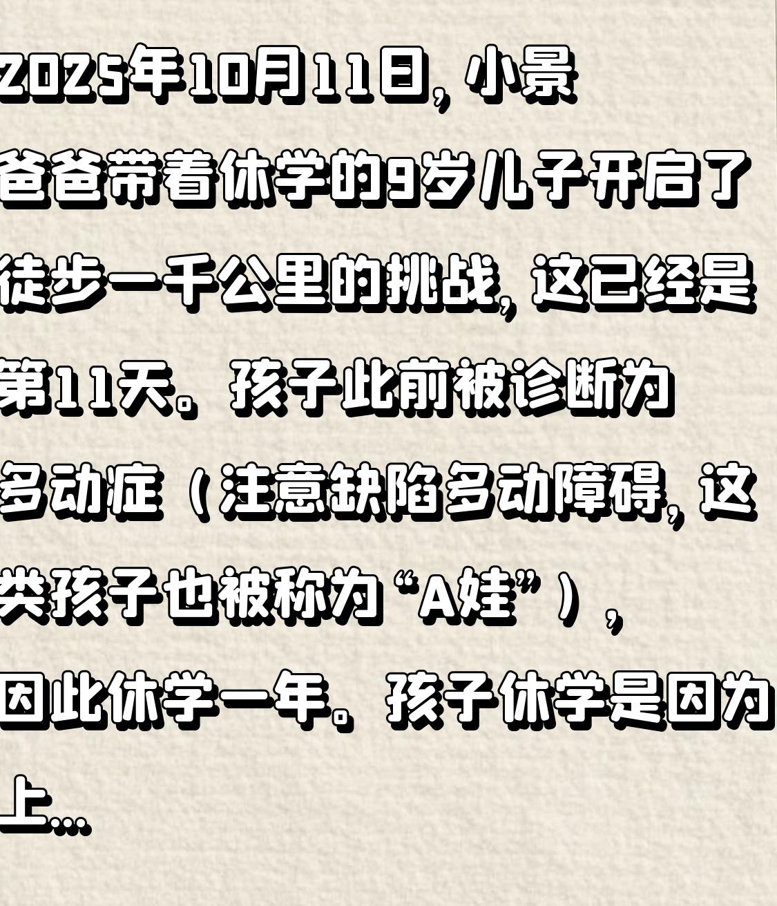 2025年10月11日,小景爸爸带着休学的9岁儿子开启了徒步一千公里的挑战,这已