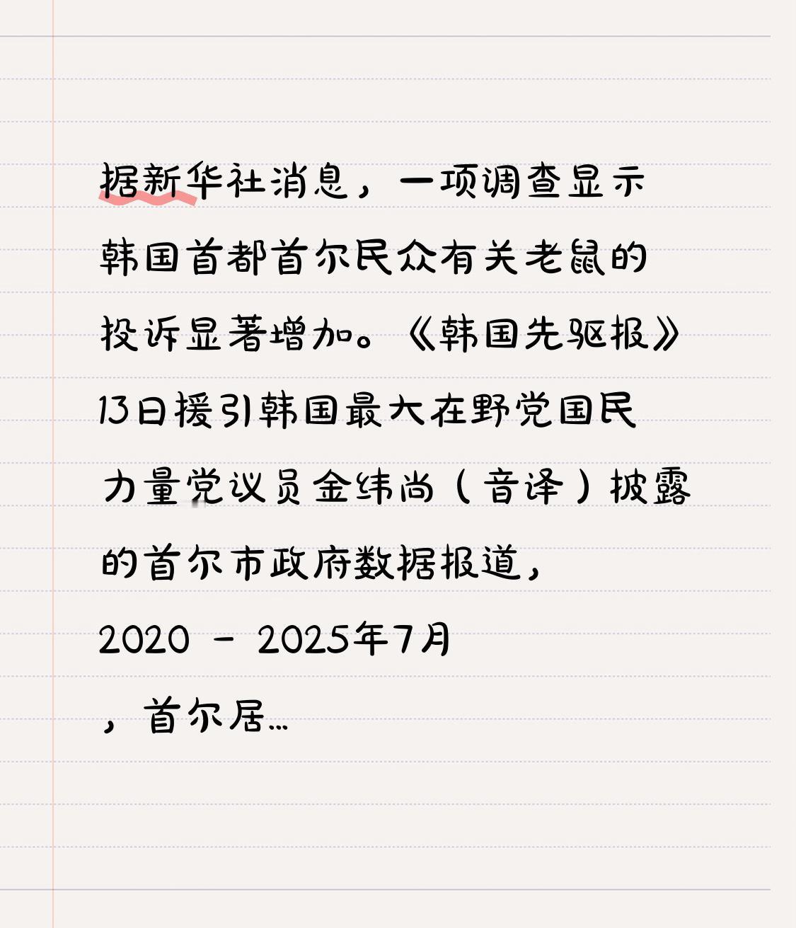据新华社消息,一项调查显示韩国首都首尔民众有关老鼠的投诉显著增加。《韩国先驱报》13日援引韩国最大在野党国民力量党议员金纬尚(音译)披露的首尔市政府数据报道,2020 - 2025年7月,首尔居民关于老鼠的投诉多达9280件,具体每年投诉数量如下: ●2020年:1279件; ●2021年:1043件; ●2022年:1336件; ●2023年:1886件; ●2024年:2181件; ●2025年截至7月:1555件。 分析表明,老鼠增多主要是因为冬季偏暖、夏季高温天气增多、强降雨频繁等气候变化因素。随着全球气候变化,首尔冬季气温偏高,老鼠活跃时间增多、繁殖季节延长,这是老鼠数量增加的主要原因。此外,首尔市政府推测,夏季热浪和强降雨频频以及一些城市开发项目和施工活动较多,也会让人们更容易发现老鼠。例如,当暴雨及洪水来袭时,老鼠往往会成群结队从下水道等藏身处逃到地面上;天热时,老鼠也倾向于跑到地面上寻找更凉爽的栖身场所。 报告指出,尽管首尔市整体鼠患情况目前不算严重,但老鼠增多这一趋势不容忽视,有必要定期监测,并采取有力的防治措施。韩国特别调查团 韩国民众 韩国内部调查 韩国首尔风波 韩国戒严调查 韩国春节争议 首尔治安