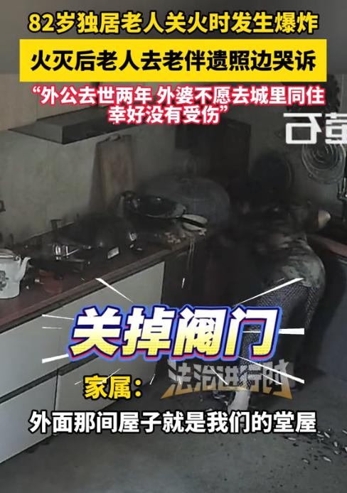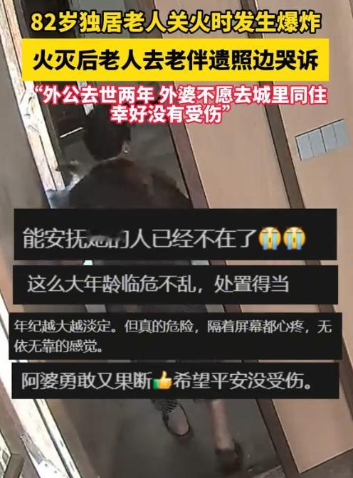 泪目了!浙江绍兴82岁独居老人做饭时,突然遇液化气闪爆,老人却眼神没乱、动作没停,冷静关阀灭火的举动获赞 “比年轻人还强”,可火灭后她对着老伴遗照哭的画面,却戳中无数人。 10 月 12 日,老太太老伴去世多年,自己独自生活,跟平常一样在厨房忙活做饭,可就在关火的工夫,意外突然来了,液化气 “砰” 的一声闪爆,火一下就窜了起来。 换作一般人,遇上这事早慌得手脚冰凉了,可老太太没乱阵脚,手疾眼快先把液化气钢瓶的阀门给关了。 后来专业人员上门检查才弄明白,是之前换气瓶的时候,气管被扯松了,关火时的回火才引了这出险事儿。 也算是不幸中的万幸,橱柜是防火的,火没烧起来多大,老太太除了吓着一跳,身上一点伤都没有,这可真是 “吉人自有天相”。 但监控里接下来的画面,让不少人看了心里不是滋味。火灭了之后,老太太慢慢挪到里屋,对着墙上老伴的遗照,眼泪就忍不住掉下来了。 她外孙说,外公已经走了两年了,家里人早就想接外婆去城里住,可老人说啥都不愿意,就想守着老家的房子。 有人说:“年轻人遇上这事儿,未必有老太太这么利索,遇事不慌,比好多人都强!” 还有人看着老太太哭的样子感慨:“能心疼她、安慰她的人不在了,这眼泪看得我也跟着掉。” 更有人说透了老人的心思:“人受了委屈,第一时间就想找最亲的人说,哪怕只是张照片。 老伴活着的时候,指定把她宠上天了。 还有条评论说得特别实在:“她当时肯定先想起老伴儿,可转念又知道得自己想办法,等火灭了静下来,才猛得想起人早走了,这种滋味儿,没经历过的人不懂。” 这位老太太,她不愿意去城里,其实好多独居老人都这样。他们守着的不只是老房子,更是跟老伴儿的那些回忆,那些日子里的酸甜苦辣,都在这老屋里装着呢。 可安全这根弦,不管在哪儿都得绷紧。她外孙后来提醒大家,要常检查液化气软管有没有老化、接口松没松,这话真是实在话,得记在心里。 现在不少社区会上门帮老人排查隐患,可咱们做子女的,就算不在老人身边,也得常打电话叮嘱,常问问情况。 那些给老人发的安全设备,得帮着装好,教老人怎么用,可别让它们放着落灰。 谁家没有老人?谁又能保证自己老了不会遇到类似的情况?老太太遇事冷静,让人佩服;对着遗照哭的样子,又让人心里发酸。 说到底,独居老人的安全,既得靠老人自己多留心,也离不开家里人的牵挂,更少不了社会的帮衬。 信息来源: 法治进行时 2025-10-14 82岁独居老人关火时发生爆炸,火灭后老人去老伴遗照边哭