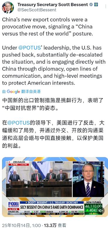 10月14日,美国财政部长贝森特表示:“中国新的出口管制措施是挑衅行为,表明了‘中国对抗世界’的姿态。在特朗普总统的领导下,美国进行了反击,大幅缓和了局势,并通过外交、开放的沟通渠道和高层会晤与中国直接接触,以保护美国的利益。” 贝森特这话说得,多少有点颠倒黑白的本事,仿佛过去大半年美国干的那些事都成了空气。先不说“中国对抗世界”这种帽子有多离谱,单说中国那两项新出口管制措施,明眼人都能看出是怎么回事。10月9日商务部发的61号和62号公告写得清清楚楚,是对含中国成分的稀土相关物项和稀土技术加强管理,依据的是《出口管制法》和《两用物项出口管制条例》,从头到尾都透着“合法合规”四个字。 稀土这东西能造电动车电机也能做军用雷达,军民两用的物资搞出口管制,全球哪个有实力的国家没这么干过?这明明是维护自身安全的常规操作,到贝森特嘴里倒成了“挑衅”。 真要论起挑事,美国才是行家。从今年4月到10月,短短半年时间,美国对华关税从34%一路飙到130%,说是对稀土管制的回应,实则早把贸易战延伸到了科技领域。之前中美在日内瓦会谈明明说好取消91%的关税,剩余部分暂停征收三个月,结果才过俩月,美国就撕了协议反手加税,连点缓冲的余地都不留。 更别提他们还追加了关键制造软件的出口限制,把AI芯片也列入禁售清单,明着是护着自己的技术,实则是想断中国高端制造的路子。 最可笑的是提“特朗普时期大幅缓和局势”,这说法估计连美国自己人都不信。就在贝森特说话前几天,10月11号美股还因为关税加码直接跳水,联邦政府刚经历了十天停摆,4200名联邦雇员等着被裁员。特朗普喊着让“三亿美国人做好准备”,可准备啥呢? 准备接受中国产的手机、家电涨价?准备看着自家农场的大豆烂在仓库里?要知道美国大豆协会早就喊过,失去中国市场是“不可逆的伤害”,而中国早就在巴西拓了新货源,国内产量也连续三年超两千万吨,根本不吃这一套。 中国的管制措施哪儿是“对抗世界”,分明是对着美国及其帮凶精准反制。美国滥用301条款、232条款当打压工具,国际社会早有不满,中国不过是按规矩办事,先向WTO递了美方违规报告,再拿出针对性措施。就连技术层面,美国的封锁也没起到预想效果,几年前还依赖进口的EDA软件,现在国产方案都能在芯片设计环节顶上去了,这哪儿是“对抗”,这是被逼着走强的自主路。 贝森特说美国靠“开放沟通”保护利益,可沟通得讲诚信吧?一边说着要对话,一边把关税加到130%,一边喊着缓和局势,一边把产业链脱钩的刀架在脖子上。这种“说一套做一套”的沟通方式,谁能信服?中国的出口管制不过是把态度摆清楚:你要搞极限施压,我就有正当反制;你要讲规矩,我也能谈合作。 说到底,美国就是习惯了用霸权逻辑说话,自己能随意加税、搞封锁,别人维护自身安全就是“挑衅”;自己把局势搅得一团乱,反倒说自己在“缓和”。现在全球产业链早就是你中有我,美国硬要筑起130%关税的高墙,挡住的不只是中国商品,还有美国消费者的性价比红利,以及自家经济复苏的路子。 贝森特与其在这儿给中国扣帽子,不如先想想怎么安抚那些丢了订单的农民,怎么解释美股的跳水和联邦雇员的饭碗问题,毕竟谎言再好听,也填不上现实的窟窿。