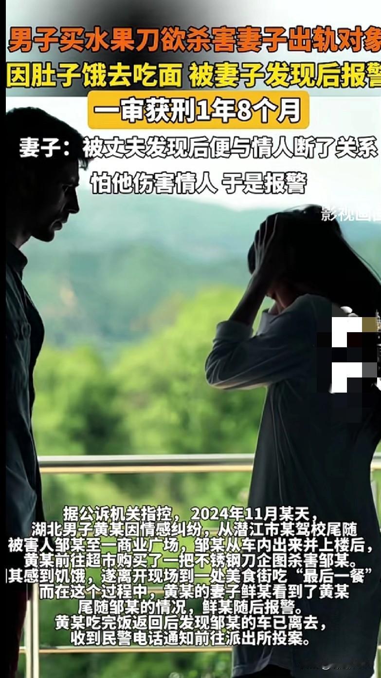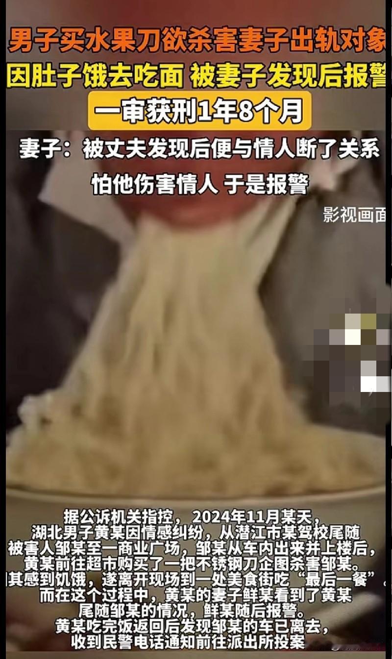 “家人们这剧情也太抓马了!湖北一男子发现老婆出轨,买了水果刀想去杀情人,结果中途肚子饿去吃面,被老婆发现后报警,最后一审获刑1年8个月。 咱就是说,这操作也太迷了!买刀杀人前还不忘吃顿‘最后一餐’,这心也太大了吧。更绝的是他老婆,都跟情人断了关系了,还怕他伤害情人赶紧报警。 感情里的弯弯绕绕真是让人看不懂,不过有啥矛盾也不能走极端啊!这事儿也提醒大家,遇到情感问题可得冷静,千万别干傻事。你们觉得这事儿离谱不?