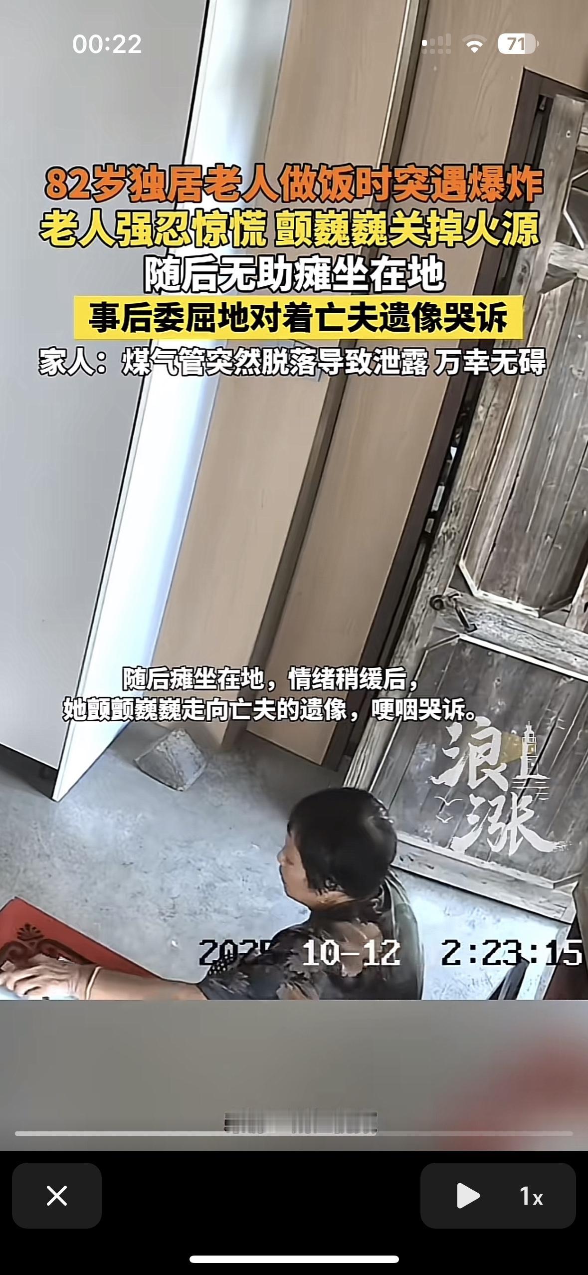 太触目惊心了!这才是人老了最可怕的事情 不是没有退休金,也不是没有子女陪在身边 而是没有老伴 82岁独居的老奶奶一个人做饭时突然爆炸 奶奶冷静的迅速关掉开关 冷静后坐在地上抱着老伴的遗像哭泣 爆炸的时候没哭,看到老伴的遗像哭了,身边连个说话的人都没有,子女也有自己的生活